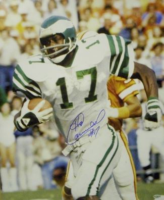 Harold Carmichael played 13 seasons for the Philadelphia Eagles (1971–1983). Carmichael was elected to four Pro Bowls in his NFL career, and led the league in receptions and receiving yards during the 1973 season. He finished third in receiving yards in 1978 with 1,072 and was second in receiving touchdowns in 1979 with 11. He was also the Eagles' top receiver of Super Bowl XV, with six catches for 91 yards. He ended his career with 590 receptions for 8,985 yards with 79 career touchdown catches, along with 64 rushing yards on nine carries. He still ranks 18th all-time in career touchdown receptions. Carmichael was selected to the NFL 1970s All-Decade Team by voters of the Pro Football Hall of Fame. Harold Carmichael has hand signed this Philadelphia Eagles 16x20 Photo. Leaf Authentics Hologram and Certificate of Authenticity from Athlon Sports.