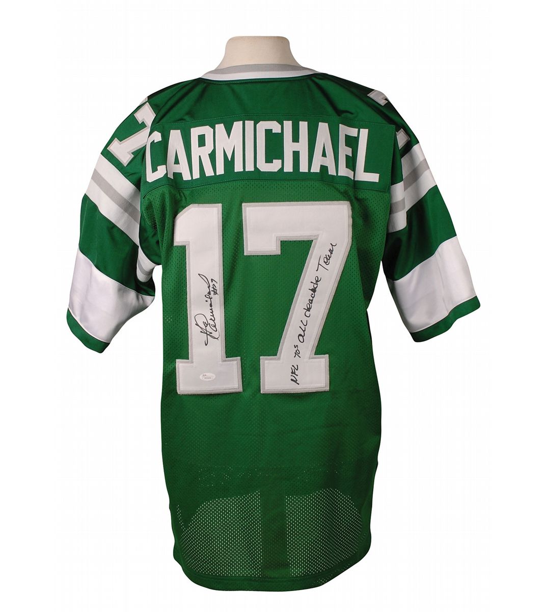 Replica Philadelphia Eagles football jersey, with sewn on letters and numbers, signed in black felt tip on the numbers on the back, “H. Carmichael #17, NFL 70s All Decade Team.” In fine condition, with a JSA label affixed to a number on the back. Accompanied by a certificate of authenticity from JSA.