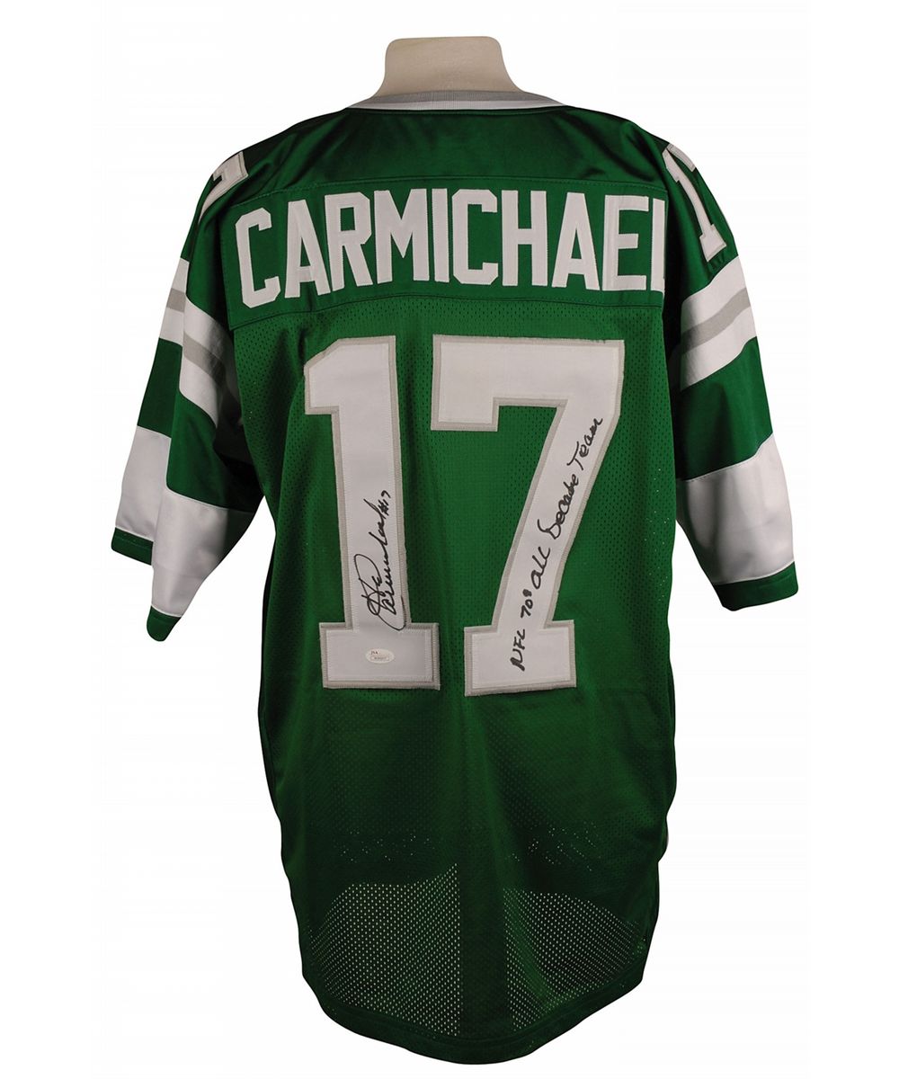 Replica Philadelphia Eagles football jersey, with sewn on letters and numbers, signed in black felt tip on the numbers on the back, “Harold Carmichael #17, NFL 70s All Decade Team.” In fine condition, with a JSA label affixed to a number on the back. Accompanied by a certificate of authenticity from JSA.