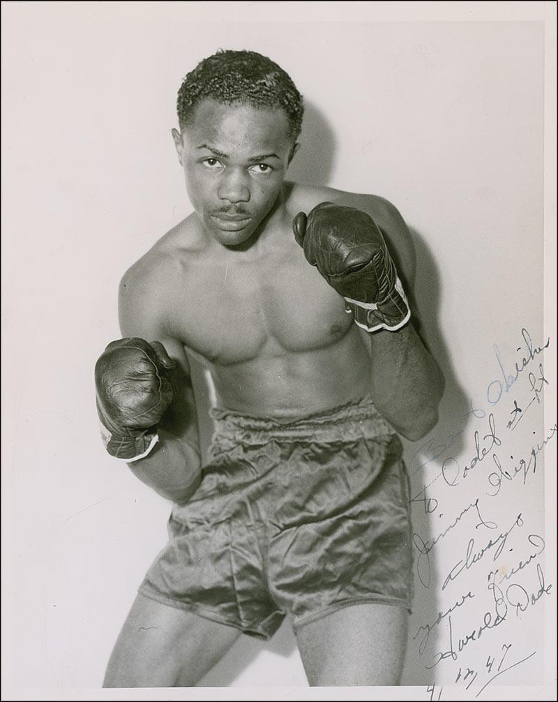 Former bantamweight champion of the world in 1947. Vintage glossy 8 x 10 photo, signed and inscribed in black ink as champion “Best wishes to Cadet Lt. Jimmy Wiggins, always your friend, Harold Dade 1/12/47.” In very good condition, with scattered creases and surface marks, and Dade switching from blue to black ink at beginning of inscription.