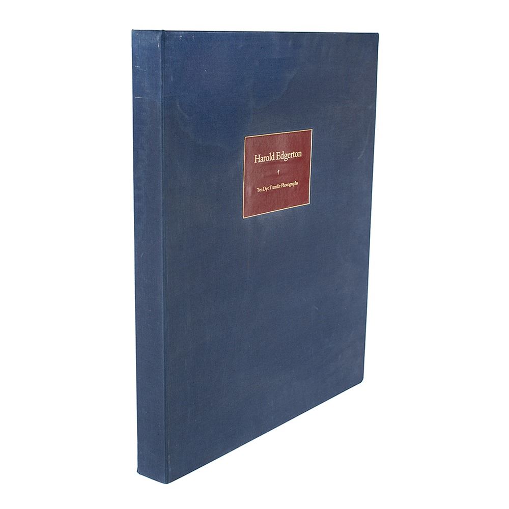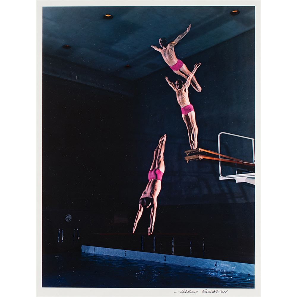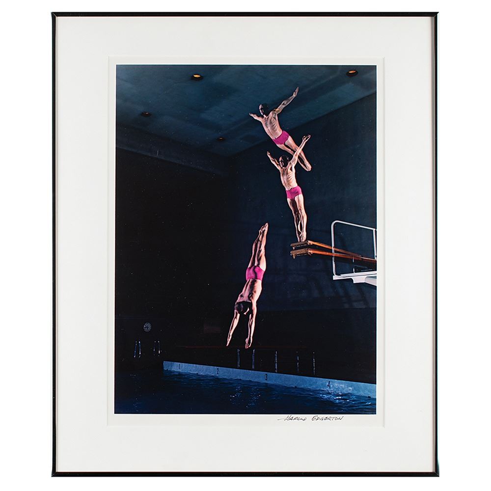 American scientist and researcher (1903–1990) who was a professor of electrical engineering at the Massachusetts Institute of Technology and was a pioneer in the development of flash photography; his most famous photograph is that of a bullet piercing an apple. He is largely credited with transforming the stroboscope from an obscure laboratory instrument into a common device, and he was also deeply involved with the development of sonar and deep-sea photography; his equipment was used by Jacques Cousteau in searches for shipwrecks and even the Loch Ness Monster. Limited edition color 14.25 x 19.25 dye transfer print of a stroboscopic photograph taken by Harold Edgerton in 1955 entitled 'Diver,' part of a pre-release of the ‘Ten Dye Transfer Photographs’ suite produced in a special limited run of 30 by Palm Press in 1984. The print features three images of former national diving champion and longtime MIT diving coach Charles Julius Batterman diving into an indoor swimming pool, and is signed in the lower border in black felt tip by Edgerton. Matted and framed to an overall size of 20.25 x 24.25. In fine condition. Accompanied by the suite’s rare and original cloth-bound presentation clamshell case, which measures 21.25 x 25.5. The consignor notes that the print and case were acquired from the estate of one of Edgerton’s colleagues at MIT.