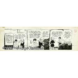 <B>Harold Gray Studios - Little Orphan Annie Daily Comic Strip Original Art, dated 9-18-67 (Chicago Tribune, 1967).</B></I> Annie has a bit of street-smart wisdom for Tim Fiddle on how to handle his teasers, " I'd pick out th' biggest wise guy in th' bunch and sock him, smack in his kisser!" It's hard to argue with a knuckle sandwich, and when is the last time you read a comic strip with such blunt advice? The image area of this daily is 20" x 6", and the art is in Excellent condition. For sheer spunk, it's hard to top Annie -- add a little punch to your art collection with this high-spirited daily! <I>From the collection of Gill Fox.</B></I>
