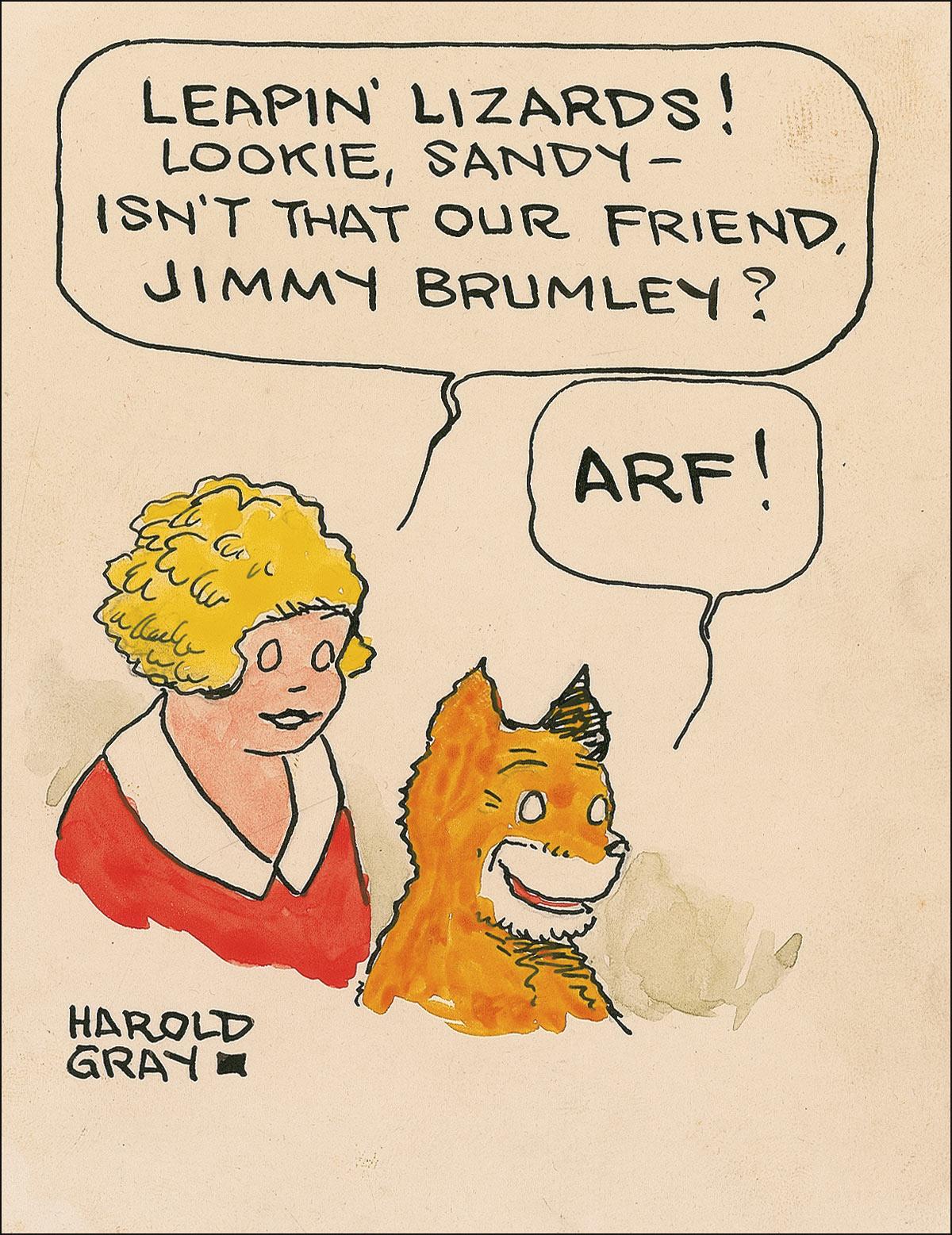 Original vintage signed and inscribed ink and watercolor sketch of Little Orphan Annie and Sandy, with speech bubbles reading, “Leapin’ lizards! Lookie, Sandy, isn’t that our friend Jimmy Brumley?” with Sandy responding, “Arf!,” on an off-white 4 x 5 card, signed in the lower left “Harold Gray.” In fine condition. RRAuction COA.