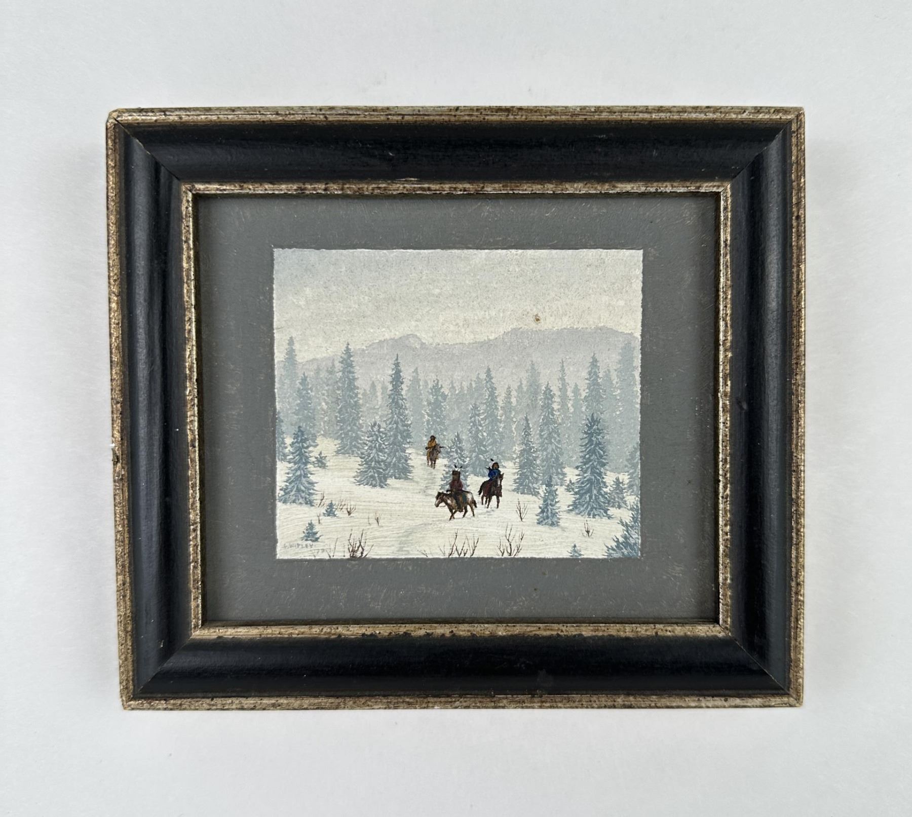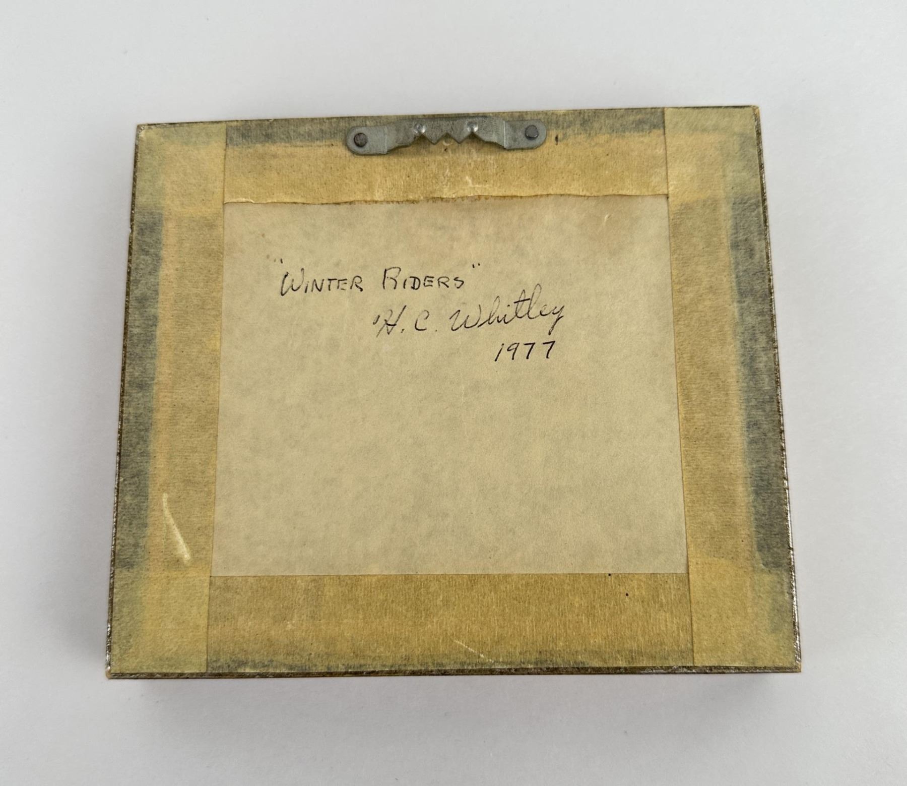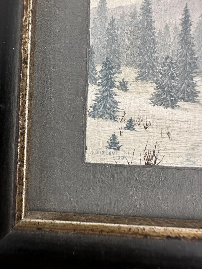 Oil on board. 4 3/4" by 5 3/8" framed. Montana Artist. Harold Whitley (1938) was active/lived in Montana. Harold Whitley is known for Painting. Believing that gold keeps the politicians honest Harold Whitley presses coins from delicate dies in his Hamilton mint where he keeps his Doberman, Hilda, and a trusty side arm around just in case. HAMILTON - At the United States Mint in Denver, 59 coin presses operate 24 hours a day, five days a week to produce 27 million pieces a day. At the Whitley Mint in Hamilton there are only two presses, one manual and one electric that operate two to seven days a week and produce from 20 to 100 coins daily. At the Denver mint many different coins are made, but the only gold to be seen Is in a glass-enclosed display case. The Whitley Mint produces only three types of coins, but each Is .999 plus pure gold. At the Whitley Mint, the owner, Harold Whitley, is the entire production crew. He melts and rolls out the metal ingots into strips and cuts out the planchets or discs with a punch press. He Inserts a single disc, with the two steel dies which make the coin Impressions, Into a die collar. He must be sure there are no fingerprints or grease spots on the dies to mar the finished coin. The die collar is placed on the press and pressure is applied to stamp the coin. Next Whitley takes the die collar apart, knocks out the coin and applies a ridged edge with a hand-operated knurling machine, The completed coin Is weighed. If it Is not a hair overweight It Is not good enough for Whitley and It is melted down to be restruck. small coins are more negotiable than the larger ones. They are a survival asset during an economic crisis, he said. Whitley spent most of his youth on his grandparents' cattle ranch in Humboldt County, Calif. He moved to the Darby area in 1956 at the age of 18 and worked as a guide and packer. He is a self-taught artist and sold his first oil painting in 1959, when he was In the Army. He also did a lot of wood carving and clay sculpture. Whitley became a full-time artist in 1966. A 1970 exhibit of his art pieces at the Whitney Gallery of Western Art In Cody, Wyo., opened a lot of doors, he said. His work Is now seen in galleries in Great Falls, Sun Valley, Idaho, and other areas..