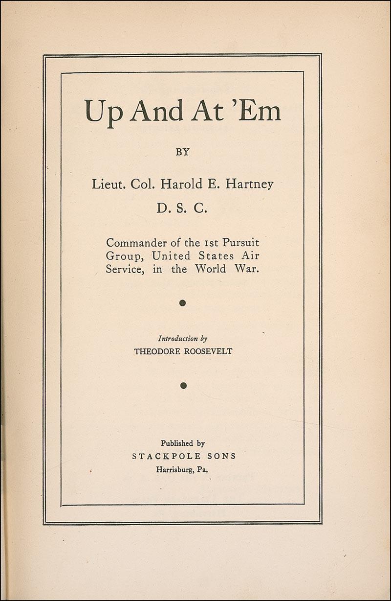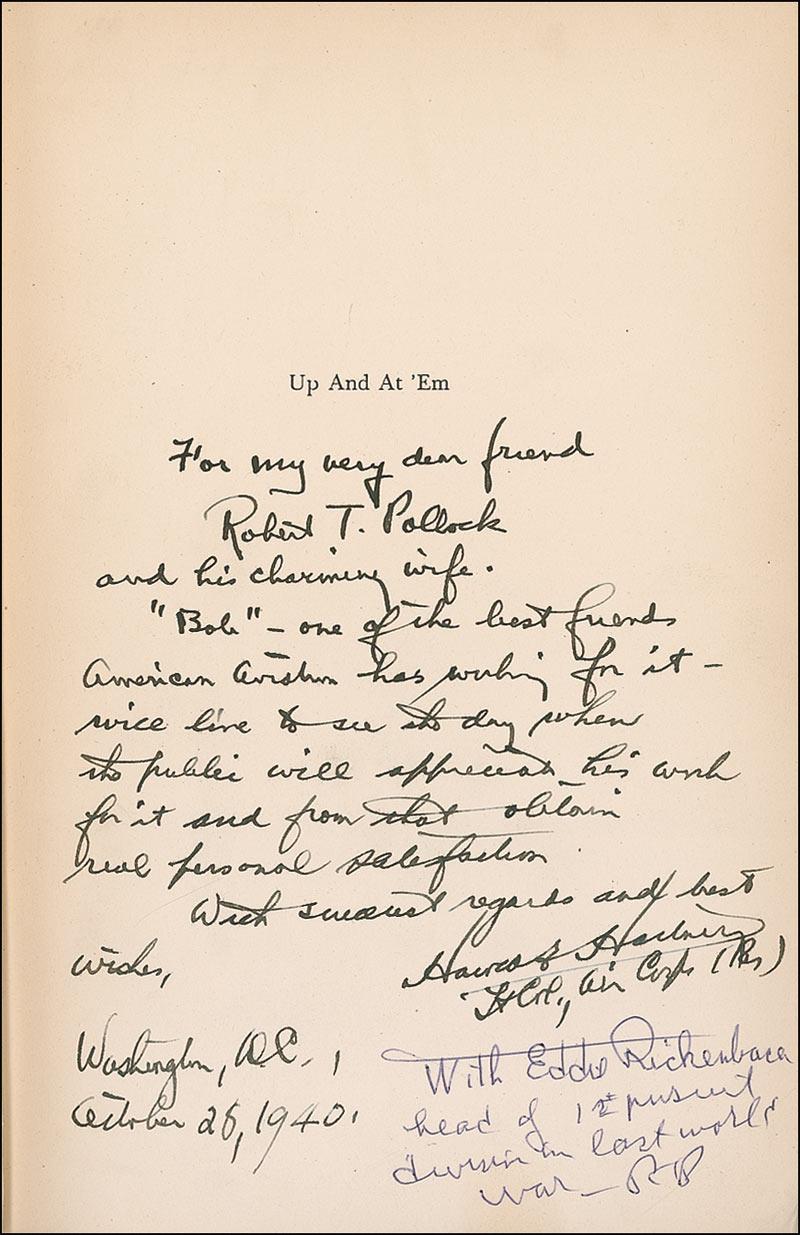 Signed book: Up and At ‘Em. First edition, later printing. Harrisburg: Stackpole Sons, 1940. Hardcover, 6.25 x 9.25, 333 pages. Signed and inscribed in fountain pen on the half-title page, “For my very dear friend Robert T. Pollack and his charming wife. ‘Bob’-one of the best friends American Aviation has working for it—will live to see the day when the public will appreciate his work for it and from that obtain real personal satisfaction. With sincerest regards and best wishes, Harold Hartney, Lt. Col., Air Corps (Ret), Washington, D. C., October 28, 1940” with a ballpoint notation by Pollack at the bottom of the page. In very good condition, with mild toning to signed page, as well as opening pages and pastedowns, fraying and soiling to covers and spine, as well as some peeling to spine.