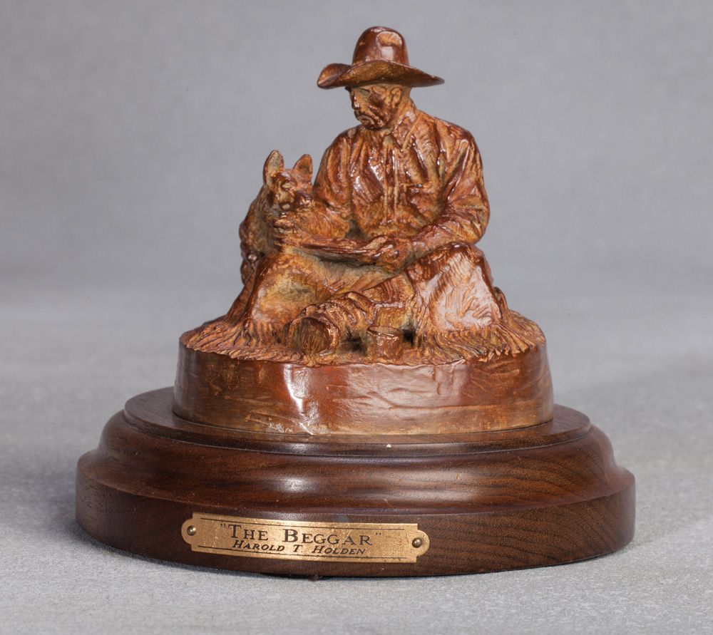 Harold Holden (b. 1940). The Beggar. 4 1/2" x 4 1/2" x 5" (plus 1 1/52" wood base). Signed in bronze and dated 1977, 26/50. PROVENANCE: Jackie L Coles Collection. Being sold to benefit the National Cowboy & Western Heritage Museum's Program and Acquisition Funds.