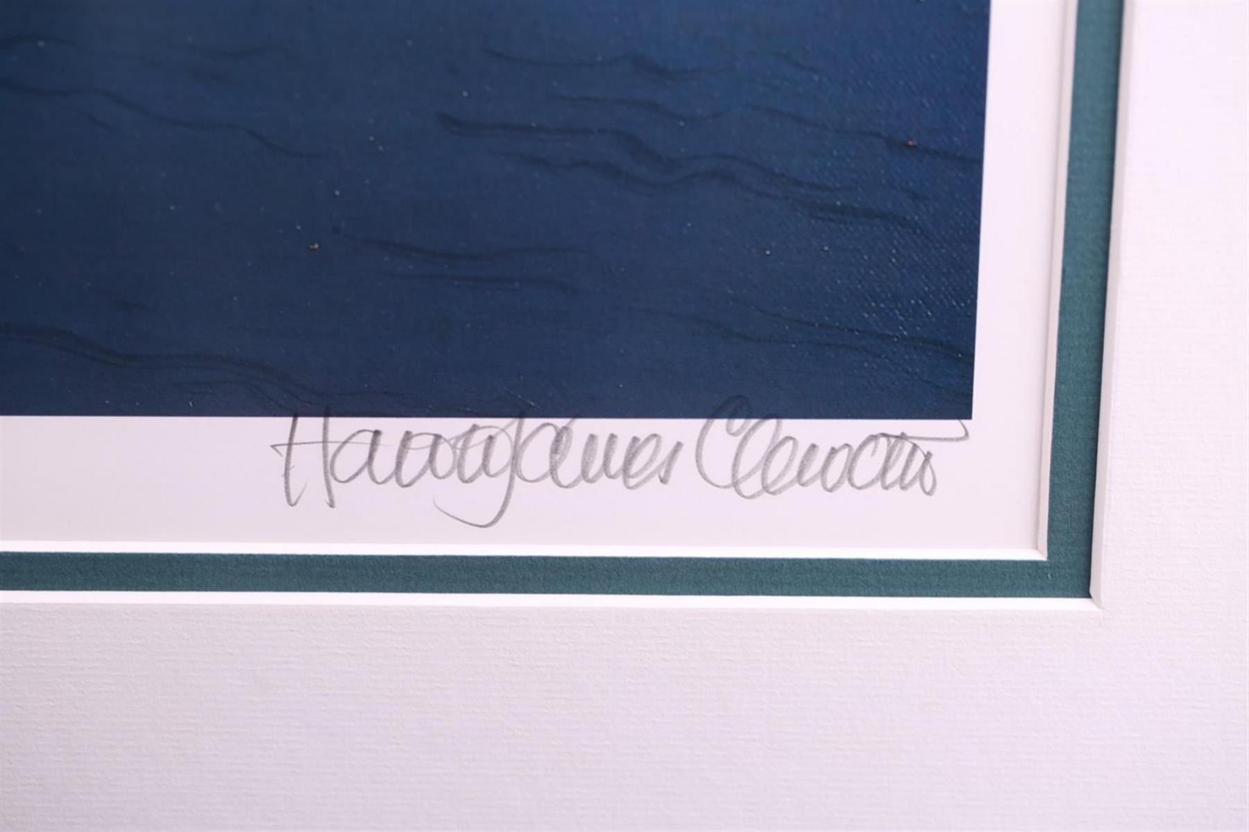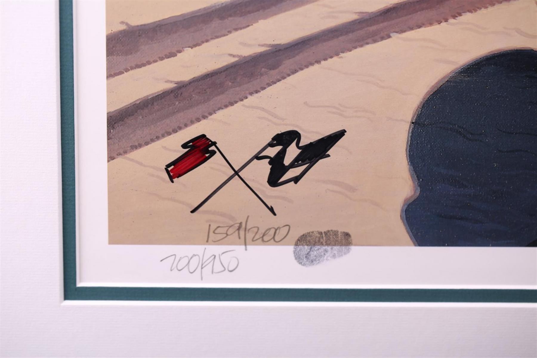 Limited Edition Lithograph #700 of 950 with Harold James Cleworth Original Signature and special 159 of 200 edition with vintage enhanced artist's actual thumbprint and original hand sketched re-marking with a Chevy Logo. Original Harold James Cleworth paintings have sold for over $100,000!! Harold James Cleworth was born in the industrial North of England during WWII. After graduating Manchester College of Art in 1967, he moved to London to work for Decca Records illustrating the first album covers for the Rolling Stones, The Who and other new groups. In 1972, he moved to California choosing automobiles as the new subject. The Chase Manhattan Bank of Zurich bought his first original and private collectors began to commission him to paint portraits of their Bugattis, Duesenbergs and Ferraris. Galleries invited him to exhibit in San Francisco, Santa Monica, Beverly Hills and Carmel. The dimensions are 34 inches by 41 inches. Comes with Certificate of Authenticity.