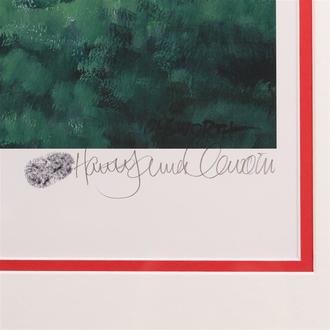 Limited Edition Lithograph #400 of 500 with Harold James Cleworth Original Signature with vintage enhanced artist's actual thumbprint and original hand sketched re-marking with a Ferrari Logo. Original Harold James Cleworth paintings have sold for over $100,000!! Harold James Cleworth was born in the industrial North of England during WWII. After graduating Manchester College of Art in 1967, he moved to London to work for Decca Records illustrating the first album covers for the Rolling Stones, The Who and other new groups. In 1972, he moved to California choosing automobiles as the new subject. The Chase Manhattan Bank of Zurich bought his first original and private collectors began to commission him to paint portraits of their Bugattis, Duesenbergs and Ferraris. Galleries invited him to exhibit in San Francisco, Santa Monica, Beverly Hills and Carmel. The dimensions are 34 inches by 41 inches. Comes with Certificate of Authenticity.
