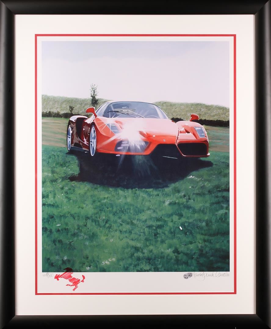 Limited Edition Lithograph #400 of 500 with Harold James Cleworth Original Signature with vintage enhanced artist's actual thumbprint and original hand sketched re-marking with a Ferrari Logo. Original Harold James Cleworth paintings have sold for over $100,000!! Harold James Cleworth was born in the industrial North of England during WWII. After graduating Manchester College of Art in 1967, he moved to London to work for Decca Records illustrating the first album covers for the Rolling Stones, The Who and other new groups. In 1972, he moved to California choosing automobiles as the new subject. The Chase Manhattan Bank of Zurich bought his first original and private collectors began to commission him to paint portraits of their Bugattis, Duesenbergs and Ferraris. Galleries invited him to exhibit in San Francisco, Santa Monica, Beverly Hills and Carmel. The dimensions are 34 inches by 41 inches. Comes with Certificate of Authenticity.