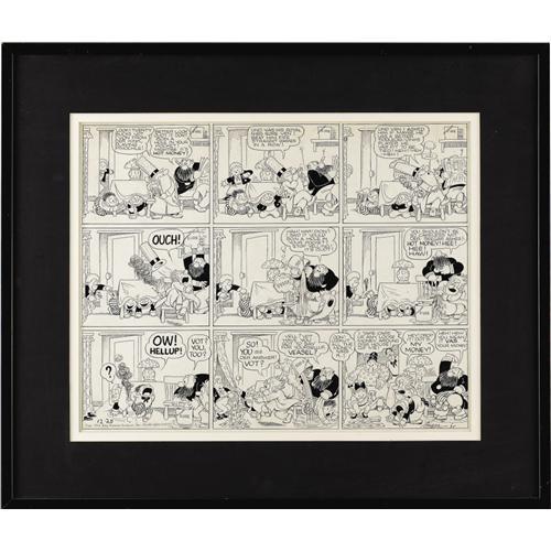 <B>Harold Knerr - The Katzenjammer Kids Sunday Comic Strip Original Art, dated 12-25-38 (King Features Syndicate, 1938).</B></I> Harold Knerr's use of outrageous humor continued the hallmark of the <I>Katzenjammer Kids</B></I> comic strip legacy, even as Rudolph Dirks left his feature to create the rival <B>Captain and the Kids</B></I>. Meanwhile, the Kids continued to create headaches for all they met with their slapstick pranks -- even on Christmas Day! This Sunday has an image area that measures 16.5" x 13", and the art is in Excellent condition. <I>From the Estate of Bruce Hamilton.</B></I> <BR><BR><B>Important notice:</B> Heritage usually auctions material at the rate of 200-250 lots per hour. On some occasions eBay Live bid software or the Internet may not be able to keep up with the pace of the auction. We recommend placing a realistic absentee bid now as insurance to avoid disappointment. Occasionally the auctioneer may eliminate or reject an eBay Live bid, and the auctioneer may also reopen a lot after the close of the eBay live bidding (usually because we missed an audience bid), and may reject your bid even if it shows you as the winning bidder. By bidding via eBay Live, you agree that Heritage may award the lot to another bidder at its sole discretion under the circumstances described above or any other reasonable circumstances. Since eBay bids are not shown to us until we open the lot on the floor, we treat those bids just like floor bids. In most cases the floor responds before the eBay bid is presented to us, due to Internet lag time, so for consistency we have made it a policy that floor bids are always considered first over tie eBay live bids. Also please note that all Heritage lots purchased through eBay Live carry a 22.5% Buyer's Premium. Please make sure you read the Terms and Conditions before you bid. This lot is being auctioned in conjunction with a live floor auction by Heritage Auction Galleries. All final auction and invoice information will be supplied by Heritage Auction Galleries, and all other information should be considered preliminary. Lot:41001 <BR><BR><B>Winning Notification and Billing:</B> After the FINAL session in this auction is complete, Heritage will send e-mail and snail mail invoices. This process normally takes several days. All final auction and invoice information will be supplied by Heritage Auction Galleries, and all other information should be considered preliminary. <BR><BR>This auction will be conducted on a live auction floor and over the Internet through eBay Live. If you choose to place an absentee bid, please take a moment to <font color='#0000ff'><u><a href='http://pages.ebay.com/liveauctions/help/before/laabsentee.html'>learn how eBay Live absentee bidding works</a></u></font><font color='#000000'>