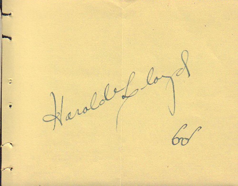 Autograph book page signed by Harold Lloyd with a sketch of glasses in the lower right corner. The page had been folded in half at some point. All items come with a certificate of authenticity good for the life of the piece.