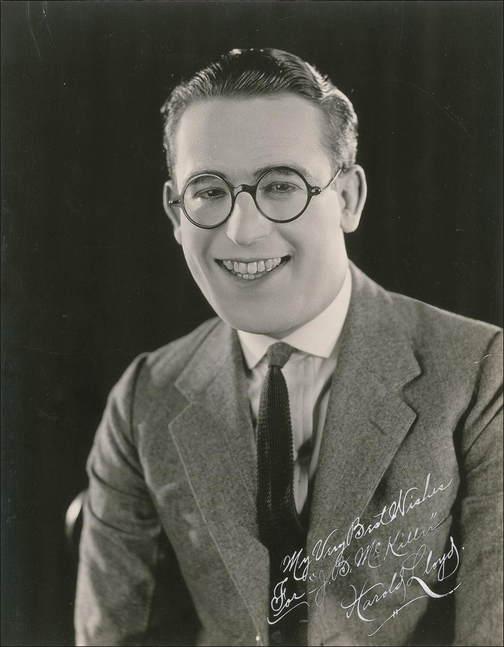 Vintage glossy 7.5 x 9.5 photo of Lloyd smiling pleasantly, signed and inscribed in white ink “My very best wishes for ‘J.B. McKiller’ Harold Lloyd.” Scattered light surface marks and creases, a bit of scattered light silvering, and a paperclip impression to top edge, otherwise fine condition. A boldly signed example from this beloved early comedy pioneer.