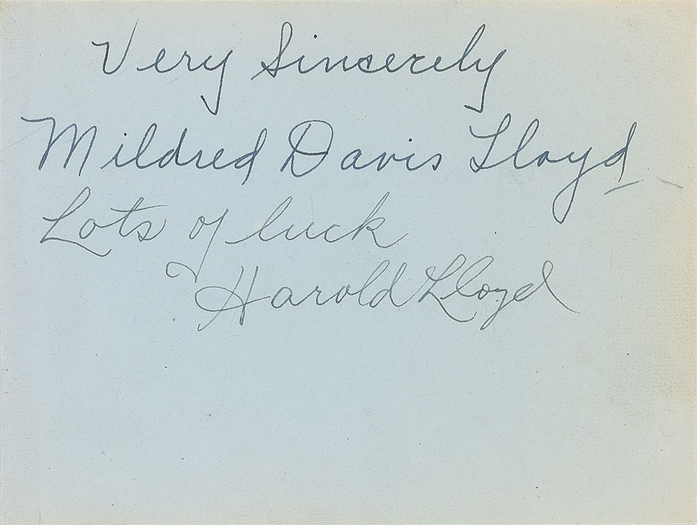 Vintage fountain pen signature, “Lots of luck, Harold Lloyd,” on a light green 4.75 x 3.75 album page. His wife and frequent co-star, Mildred Davis Lloyd, signed above, and a Douglas MacLean signature is on the reverse. In fine condition, with light toning to the right edge and a couple impressions from the signature on the reverse.