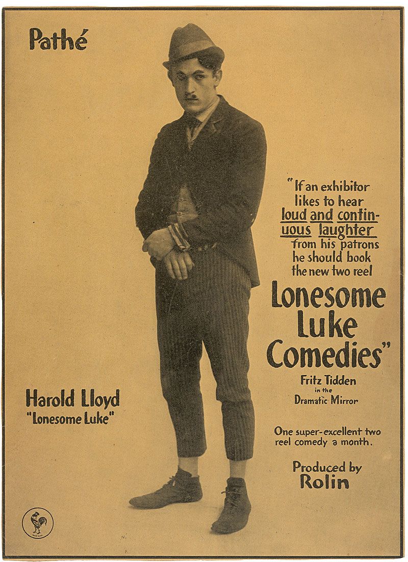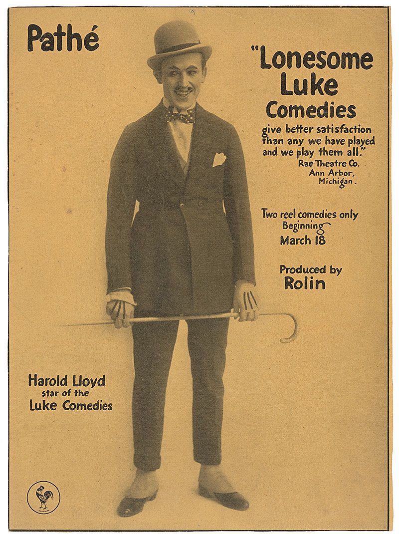 Two original vintage exhibitor ads, 7.25 x 10, both for Lloyd’s Lonesome Luke comedies, each with a printed quote from a theatre owner or critic on the films. Tack holes to top edges, a bit of soiling, and slightly trimmed edges, otherwise fine condition. Lonesome Luke was a Charlie Chaplin-like character he used from 1915–1917 as he honed his skills and worked to develop his famous eyeglass-wearing persona.
