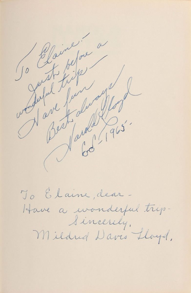 Signed book: Harold Lloyd’s World of Comedy. First edition. NY: Duell, Sloan and Pearce, 1964. Hardcover with dust jacket, 6 x 9.25, 208 pages. Signed and inscribed on the first free end page in fountain pen by Lloyd, “To Elaine—Just before a wonderful trip—Have fun, Best always, Harold Lloyd, 1965,” and in ballpoint by his wife and frequent co-star, “To Elaine, dear—Have a wonderful trip, Sincerely, Mildred Davis Lloyd.” In fine condition, with small tears and stains to edges of dust jacket.