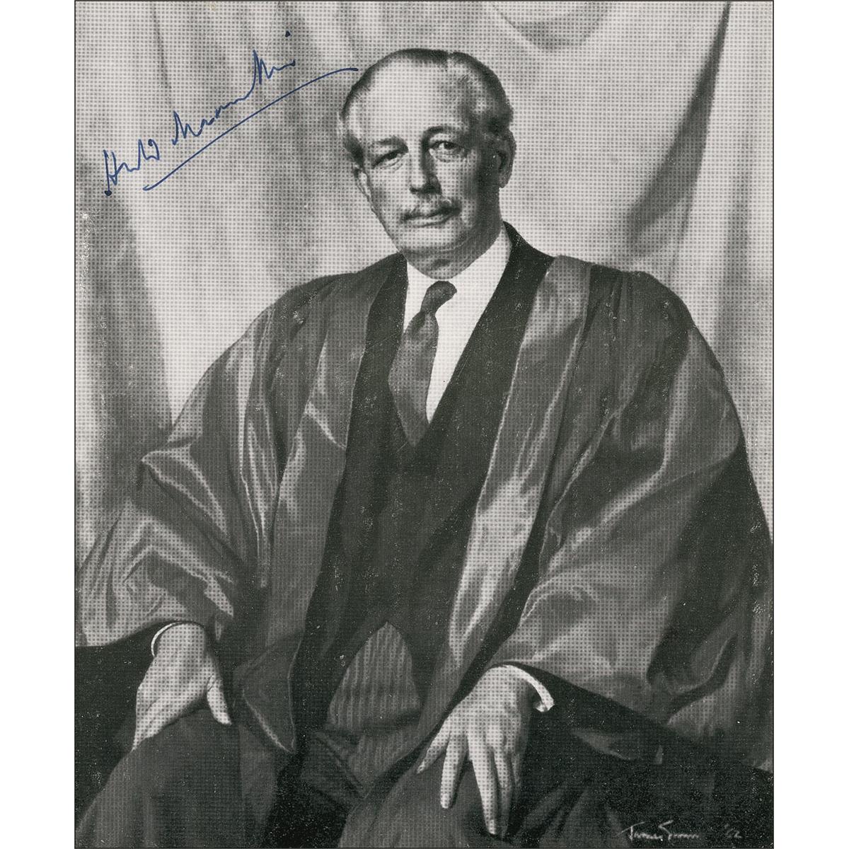 Former British prime minister. Cardstock 6 x 7.25 photo of an artist’s portrait of Macmillan in his robe, signed in black ink. In fine condition, with a couple small binder dings to edge, as well as a few light surface creases.
