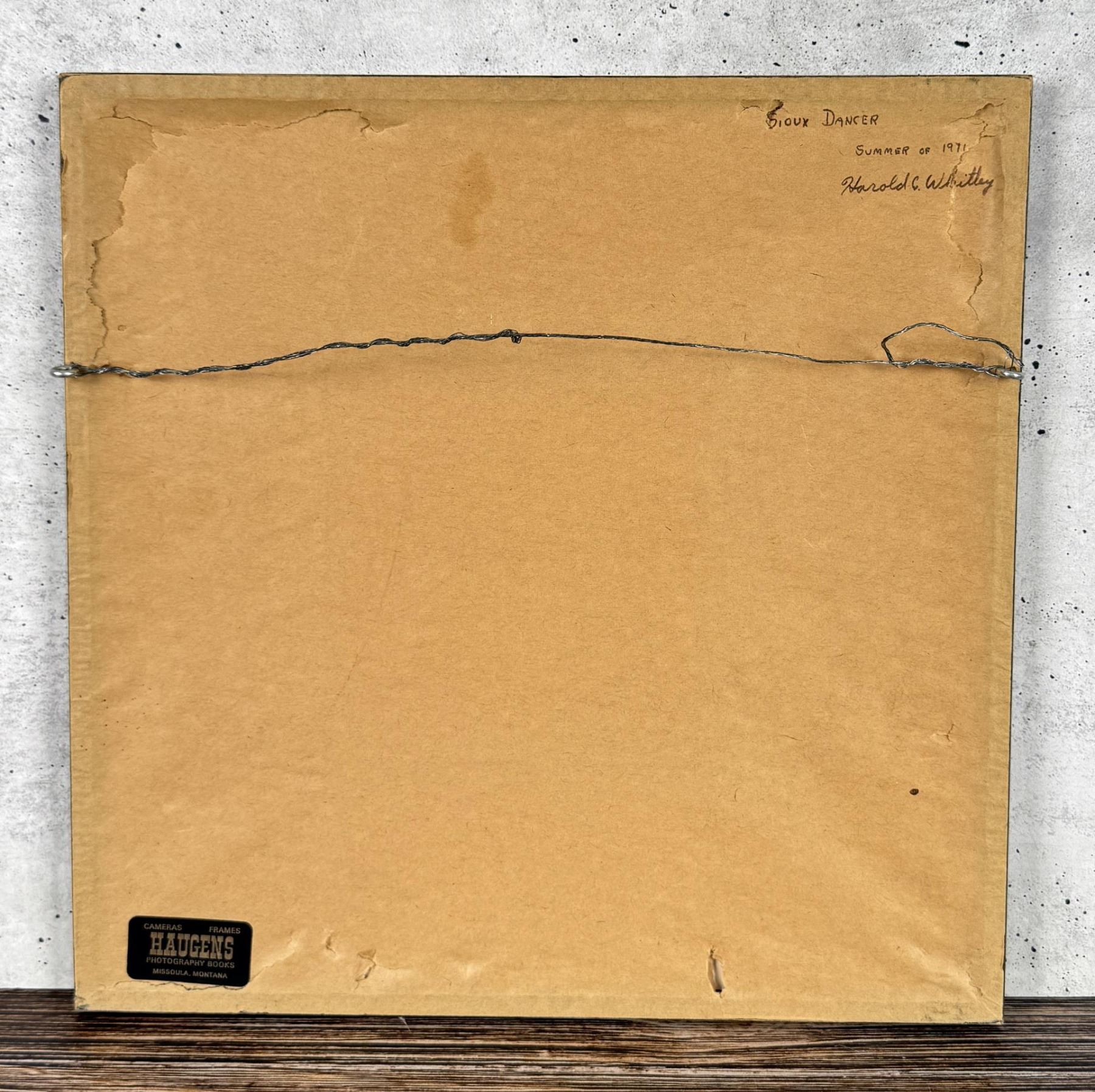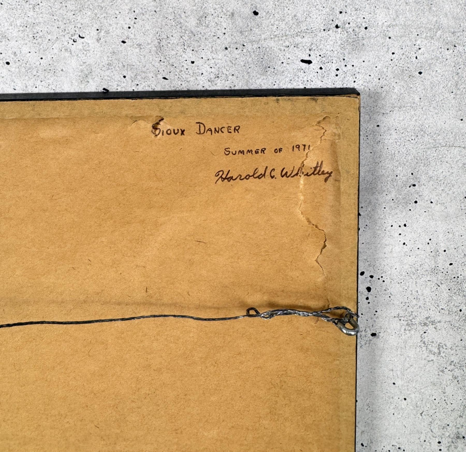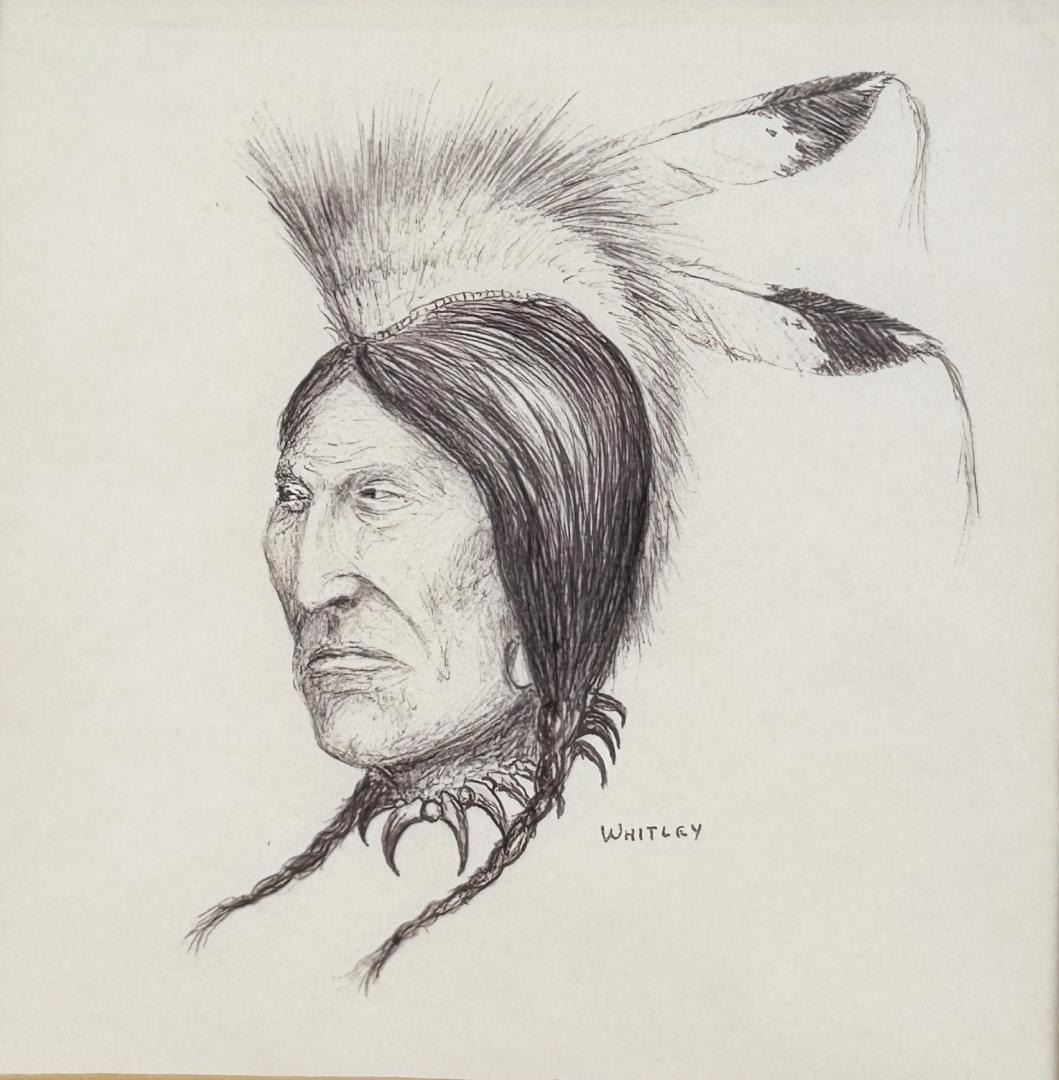 Title is Winter Indian Village. 5" by 5" unframed. 11 1/2" by 11 1/2" framed. Pen and Ink Harold Whitley (1938) was active/lived in Montana. Harold Whitley is known for Painting. Believing that gold keeps the politicians honest Harold Whitley presses coins from delicate dies in his Hamilton mint where he keeps his Doberman, Hilda, and a trusty side arm around just in case. HAMILTON - At the United States Mint in Denver, 59 coin presses operate 24 hours a day, five days a week to produce 27 million pieces a day. At the Whitley Mint in Hamilton there are only two presses, one manual and one electric that operate two to seven days a week and produce from 20 to 100 coins daily. At the Denver mint many different coins are made, but the only gold to be seen Is in a glass-enclosed display case. The Whitley Mint produces only three types of coins, but each Is .999 plus pure gold. At the Whitley Mint, the owner, Harold Whitley, is the entire production crew. He melts and rolls out the metal ingots into strips and cuts out the planchets or discs with a punch press. He Inserts a single disc, with the two steel dies which make the coin Impressions, Into a die collar. He must be sure there are no fingerprints or grease spots on the dies to mar the finished coin. The die collar is placed on the press and pressure is applied to stamp the coin. Next Whitley takes the die collar apart, knocks out the coin and applies a ridged edge with a hand-operated knurling machine, The completed coin Is weighed. If it Is not a hair overweight It Is not good enough for Whitley and It is melted down to be restruck. small coins are more negotiable than the larger ones. They are a survival asset during an economic crisis, he said. Whitley spent most of his youth on his grandparents' cattle ranch in Humboldt County, Calif. He moved to the Darby area in 1956 at the age of 18 and worked as a guide and packer. He is a self-taught artist and sold his first oil painting in 1959, when he was In the Army. He also did a lot of wood carving and clay sculpture. Whitley became a full-time artist in 1966. A 1970 exhibit of his art pieces at the Whitney Gallery of Western Art In Cody, Wyo., opened a lot of doors, he said. His work Is now seen in galleries in Great Falls, Sun Valley, Idaho, and other areas.
