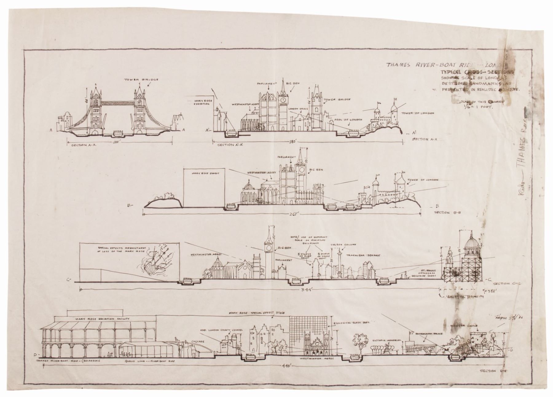 (Epcot, 1986) An original drawing by Imagineer Harper Goff showing the scale of the elements in the proposed Thames River Ride attraction for Epcot's World Showcase. This boat ride was meant to take guests on a tour of London's most celebrated landmarks, including a special effects reenactment of the loss of the Mary Rose. Measuring approximately 23.25"x32.25", the drawing is in fair to good condition with expected edge-wear from age and use. There is also moisture damage along the right side which has caused the ink to run and left spots of discoloration. There is minor wrinkling throughout from storage.