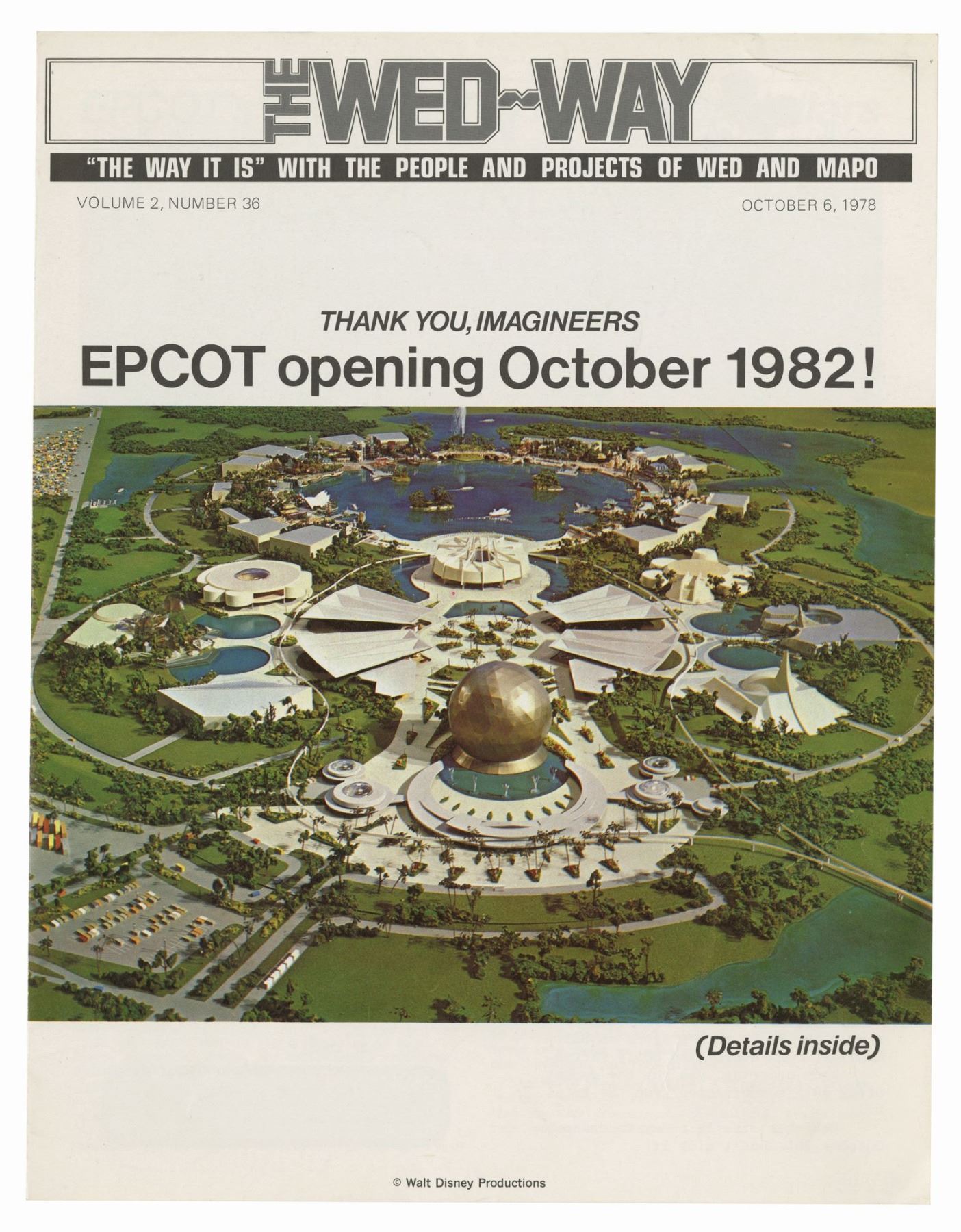 (Epcot, 1978) An issue of The WED-Way announcing the opening of Epcot in October of 1982. This particular issue comes from the estate of Disney Legend, Harper Goff. Measuring 11"x8.5", this magazine is in very good condition with minor edge-wear, including creasing along the top edge.