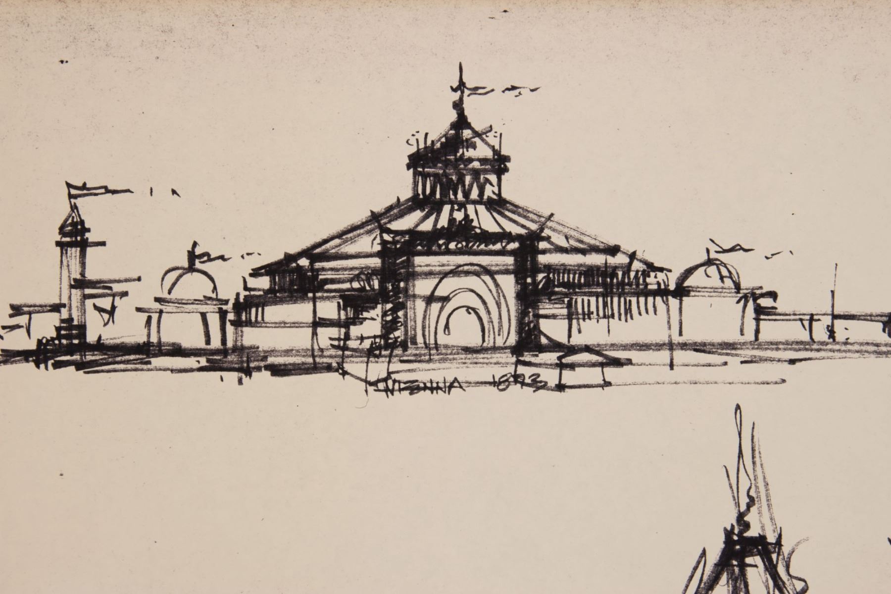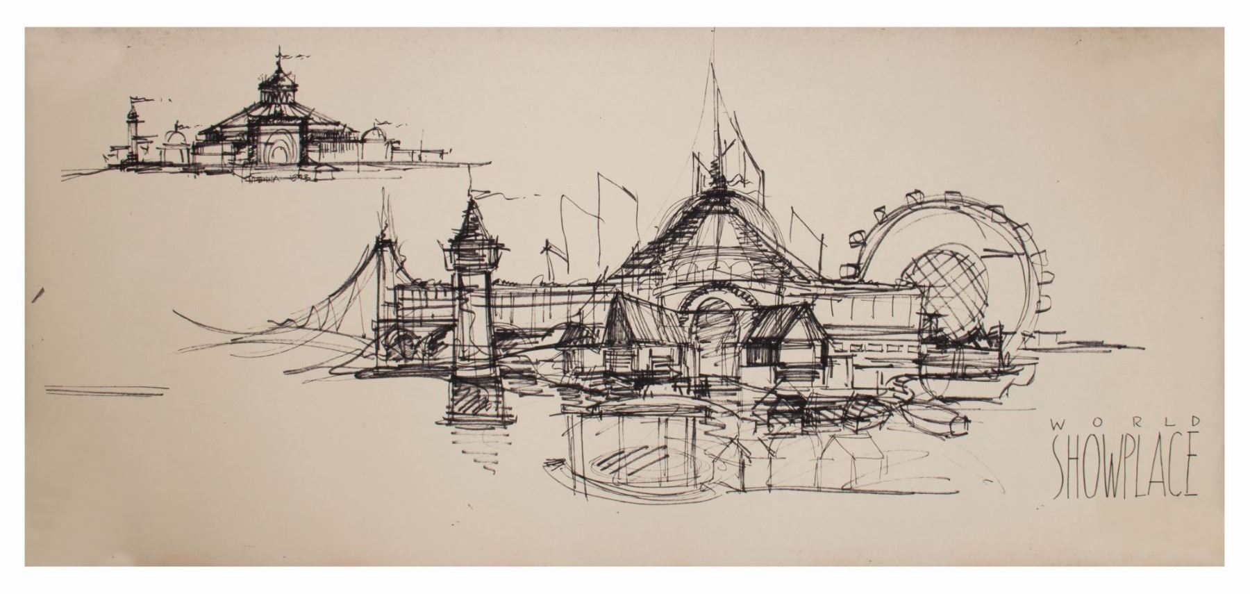 (Epcot, c.1988) A very rare brownline concept from the estate of Imagineer Harper Goff. The brownline features an early concept for an area of Epcot's World Showcase, with a smaller concept in the top-left corner labeled "Vienna 1873." The brownline provides a rare and fascinating look into the creation of Epcot's unbuilt Pleasure Island Park within the World Showcase Lagoon. Measuring 24"x54.5", the brownline is in good condition with some minor creasing and edge-wear from use.