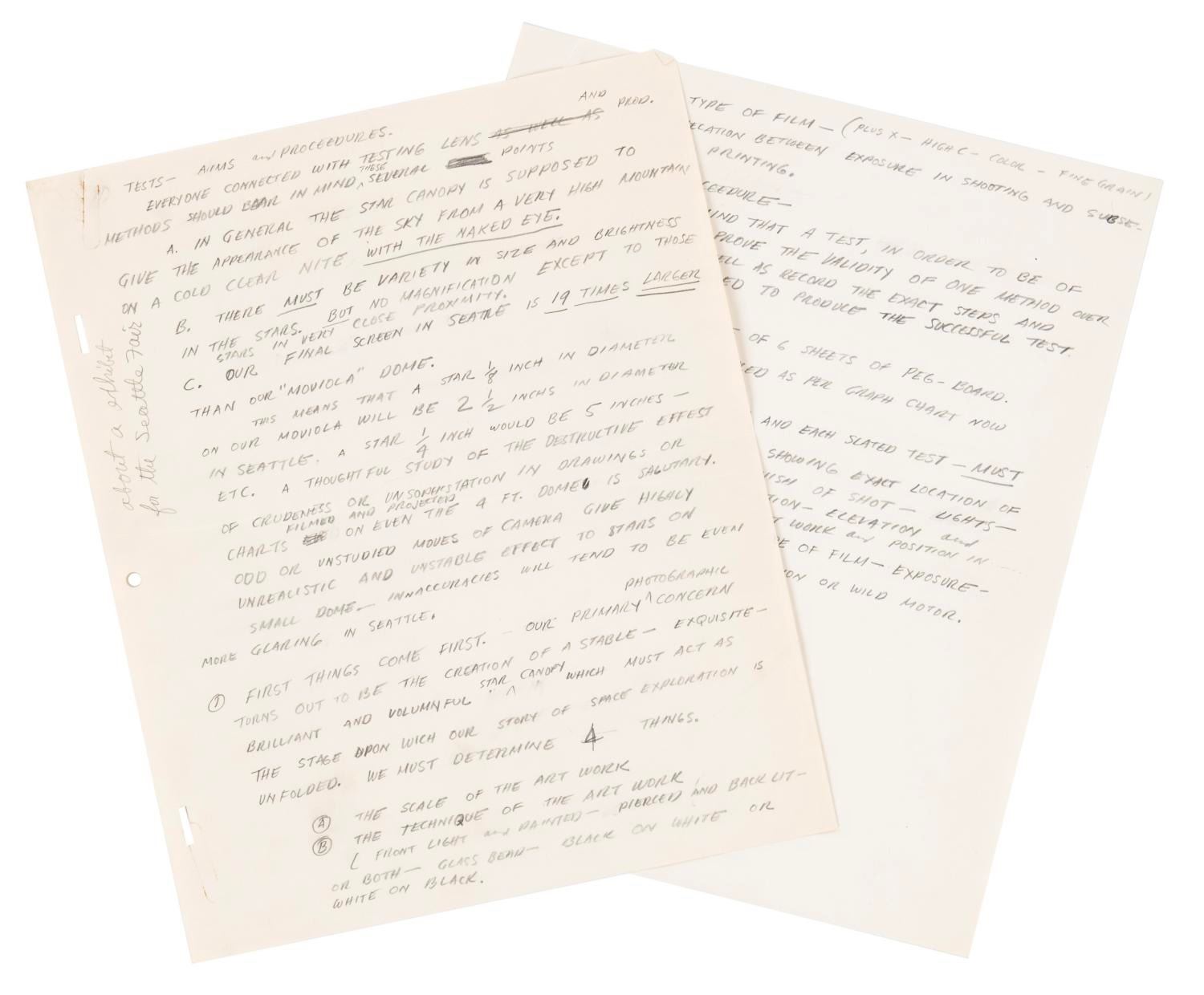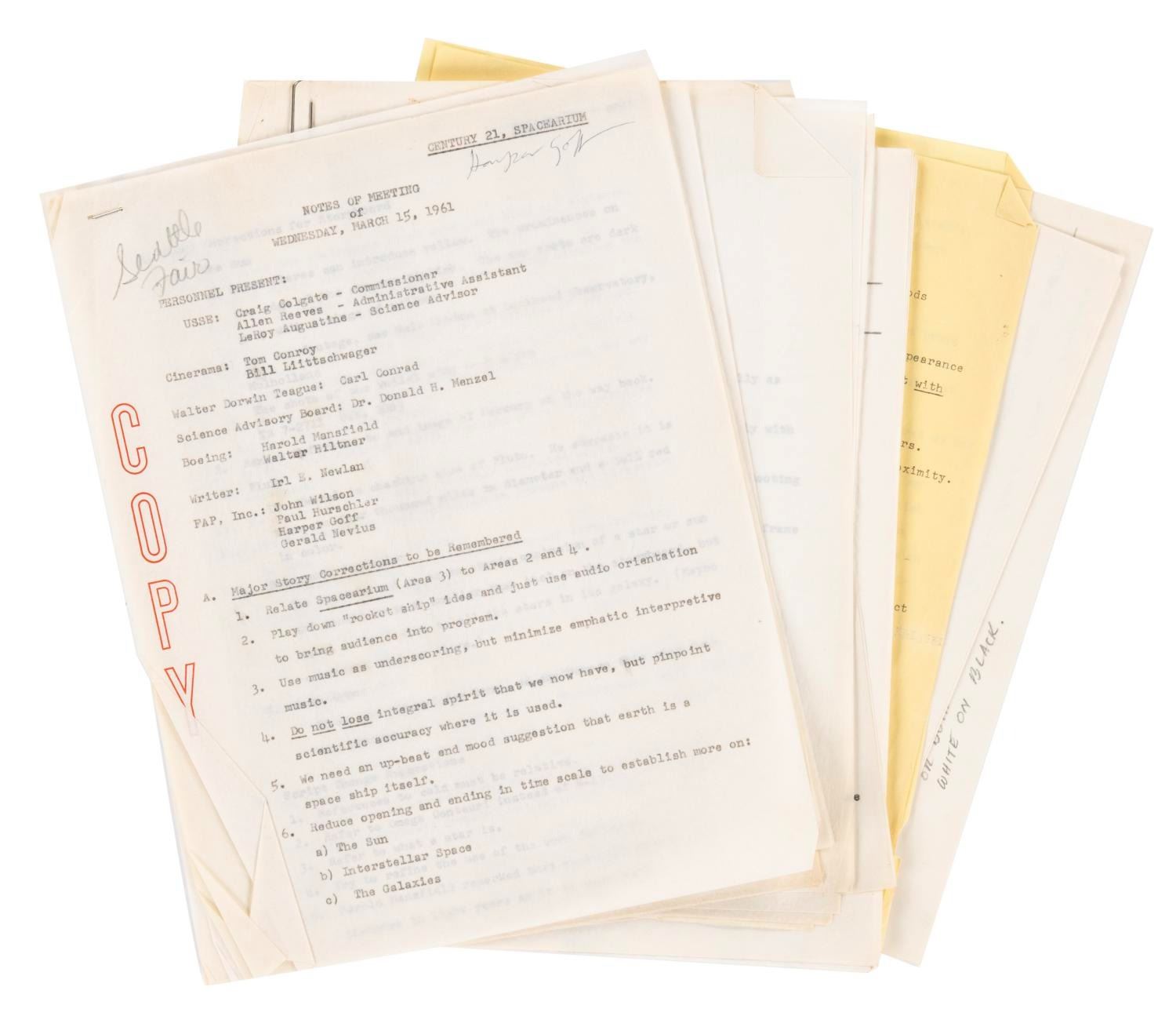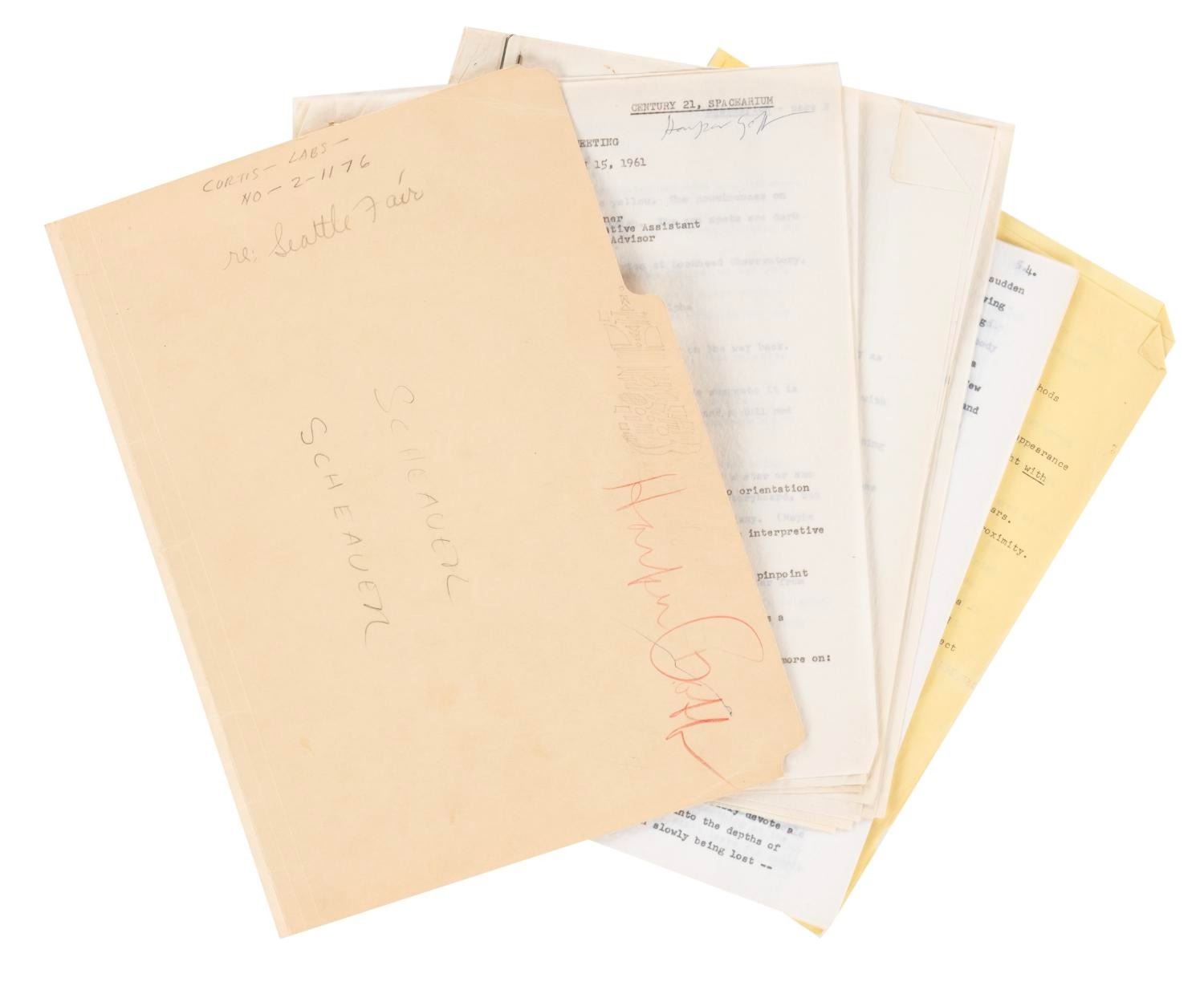 (Harper Goff, 1961) Harper Goff’s original file on the Seattle World's Fair Spacearium. The Fair was called The Century 21 Exposition, with the theme “Living in the Space Age.” The Spacearium took 750 fairgoers on a simulated voyage through the Solar System and beyond the Milky Way. Goff’s file from working on the Spacearium’s design includes papers outlining procedures and tests, reports on color processing, transcriptions from meetings, and more. Measuring from 8.5" x 11" to 10.5" x 12.75”, the papers are in good condition with light wear and discoloration from age, edge wear, and small tears and creases at the corners.