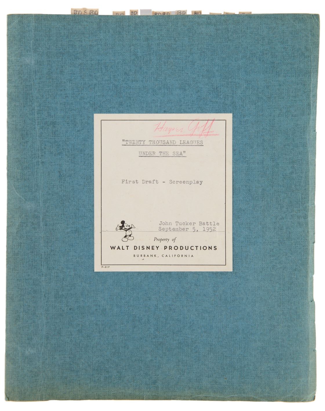 195. Harper Goff script for 20,000 Leagues Under the Sea. (Disney, 1954) Vintage original Art Director Harper Goff personal copy studio bound and bradded 163-page First Draft screenplay written by John Tucker Battle, with title and "First Draft - Screenplay, John Tucker Battle, September 5, 1952" typed and Walt Disney Productions Script label affixed to cover, with ("Harper Goff") signature in red pencil on label, with 15 divider tabs to page tops, each marked, "BD" and numbered (#7 and #12 are missing), minimal annotations in pencil, script pages are mostly dated July 8, 1952, last 15-pages dated September 4, 1952. Exhibiting production wear, handling, and age, toning and edge wear to cover. In vintage good to very good condition. Provenance: From the Estate of Harper Goff. $1,000 - $1,500
