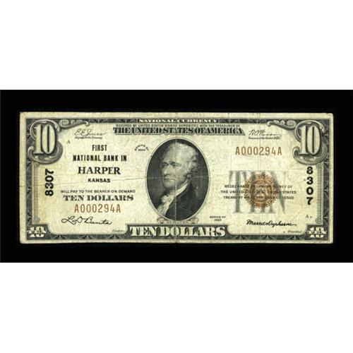 <B>Harper, KS</B></I> - $10 1929 Ty. 1 <B>First NB</B></I> Ch. # 8307<BR> A tougher Kansas small size note from the only one of this community's four banks to last long enough to issue Series 1929 examples. <B>Fine.</B></I><BR><BR><b>Shipping:</b> Coins & Currency (<a target="_blank" href="http://www.heritageauctions.com/common/shipping.php">view shipping information</a>)