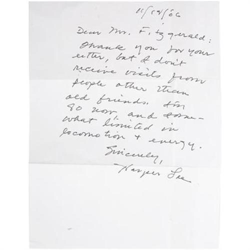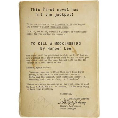 <B>Harper Lee. Advance Reading Copy of </B></I><B><I>To Kill a Mockingbird</B></I></B></I><B> with Autograph Letter Signed by Harper Lee. </B></I>Philadelphia: Lippincott, 1960. <BR>First edition, first printing, being the rare advance reading copy in publisher's printed white paper wrappers. Octavo. 296 pages.<BR><BR>Moderate age toning and occasional soiling and marks to wrappers with surprisingly gentle wear to edges and corners. Spine is moderately worn at extremities. Paper has started to peel at spine tail, but is easily restored. Textblock is in wonderful condition, clean and sharp. This magnificent book - the author's only major work - won a Pulitzer Prize, and in 2007 brought Harper Lee the Presidential Medal of Freedom for her contributions to literature.<BR><BR>Accompanied by a one-page <B>Autograph Letter Signed</B></I> by Harper Lee dated 11/18/2006: "<I>Thank you for your letter, but I don't receive visits from people other than old friends. I'm 80 now, and somewhat limited in locomotion & energy. Sincerely, Harper Lee</B></I>." Written in heavy black ink on a sheet of plain white paper. Transmittal envelope addressed by the author is included. Both are in fine condition.<BR><BR><b>Shipping:</b> Books & Catalogs (<a target="_blank" href="http://www.heritageauctions.com/common/shipping.php">view shipping information</a>)
