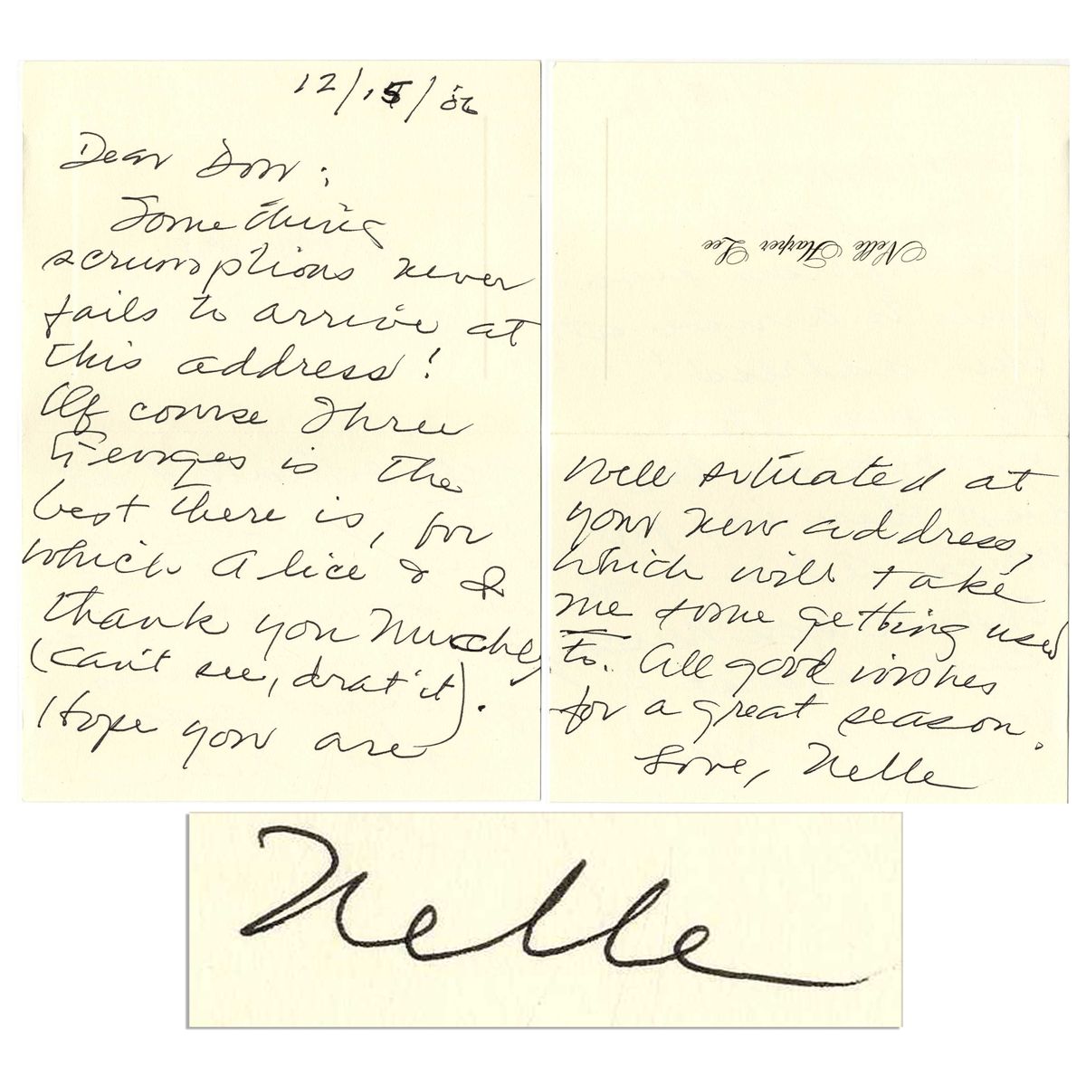 Friendly Harper Lee autograph letter signed, dated 15 December 2006, from Monroeville, Alabama, the author's hometown and the reported setting for her famous novel ''To Kill a Mockingbird.'' Written in black ink on personal stationery, letter reads in full: ''Dear Don: Something scrumptious never fails to arrive at this address! Of course Three Georges is the best there is, for which Alice + I thank you much (can't see, drat it). Hope you are well situated at your new address, which will take me some getting used to. All good wishes for a great season. Love, Nelle.'' Two page card-style letter, measures 5'' x 3.5'', with ''Nelle Harper Lee'' professionally printed on front. Includes original postmarked envelope. Near fine.