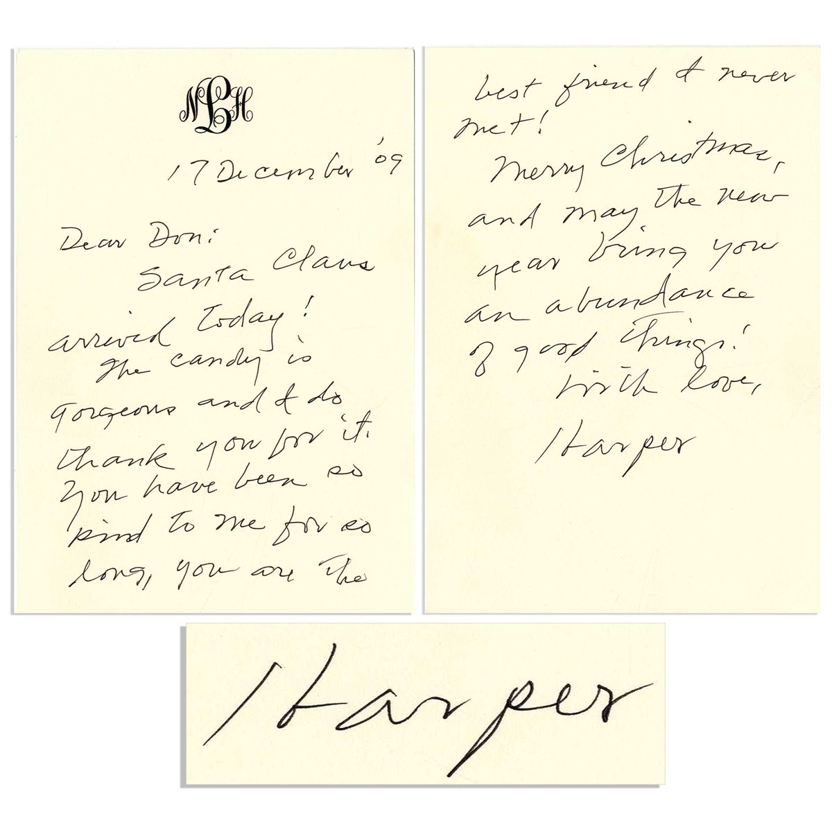 Affectionate Harper Lee autograph letter signed, dated 17 December 2009, from the author's home in Monroeville, Alabama. Addressed to Don Salter, a longtime acquaintance of Lee's, despite only knowing the author through written correspondence and never actually meeting her in person. Written in black ink on personal stationery, letter reads in full: ''Dear Don: Santa Claus arrived today! The candy is gorgeous and I do thank you for it. You have been so kind to me for so long, you are the best friend I never met! Merry Christmas, and may the new year bring you an abundance of good things! With love, Harper''. Two page letter, front and verso, measures 5.25'' x 7.5'' upon Lee's personal letterhead. Includes original postmarked envelope, where Lee signs again ''N.H. Lee'' above her return address. Near fine.