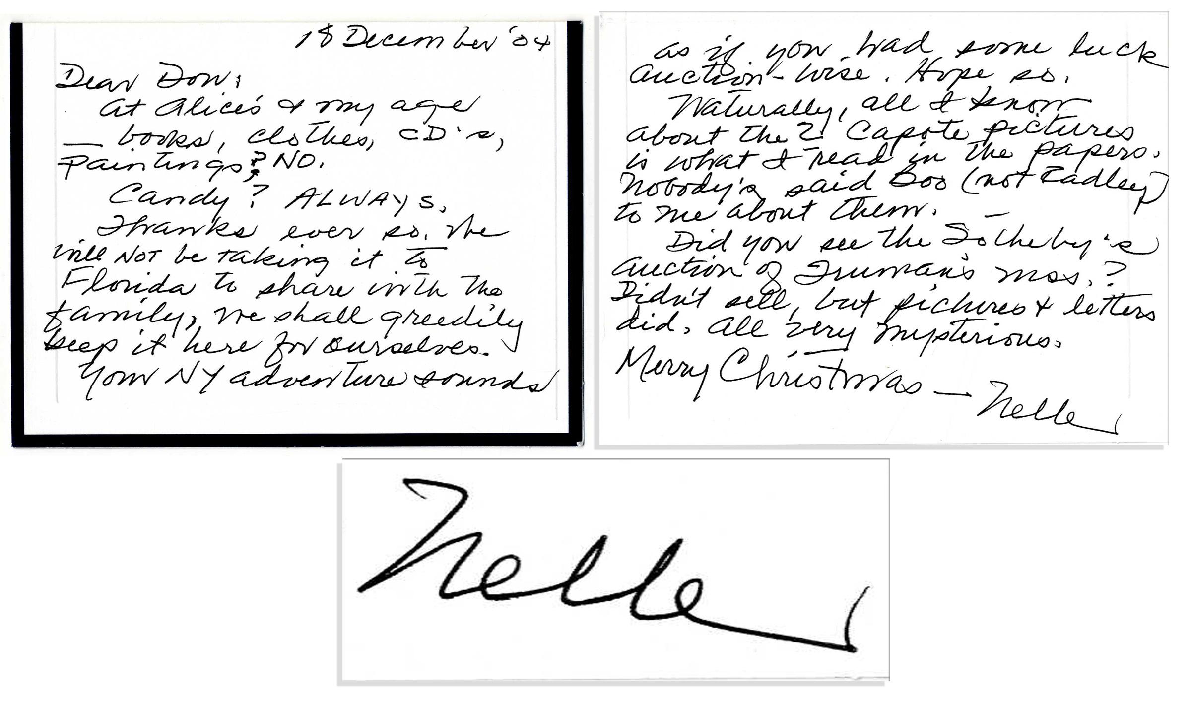 Nice Harper Lee autograph letter signed ''Nelle'', dated 18 December 2004. Letter is addressed to a Don Salter and reads in full: ''Dear Don: At Alice's & my age -- books, clothes, CD's, paintings? No. Candy? Always, Thanks ever so, we will not be taking it to Florida to share with the family, we shall greedily keep it here for ourselves. Your NY adventure sounds as if you had some luck auction-wise. Hope so. Naturally all I know about the 2 Capote pictures is what I read in the papers. Nobody said Boo (not Radley) to me about them. Did you see the Sotheby's auction of Truman's mss. [manuscripts] Didn't sell, but pictures and letters did, all very mysterious. Merry Christmas -- Nelle''. Letter, on two pages, is in a card-style format, with the first page written on the cover of the card and the second page written on its interior. Card measures 5.5'' x 4'' folded and 5.5'' x 8.25'' unfolded. Includes original envelope handwritten with address only. Fine.