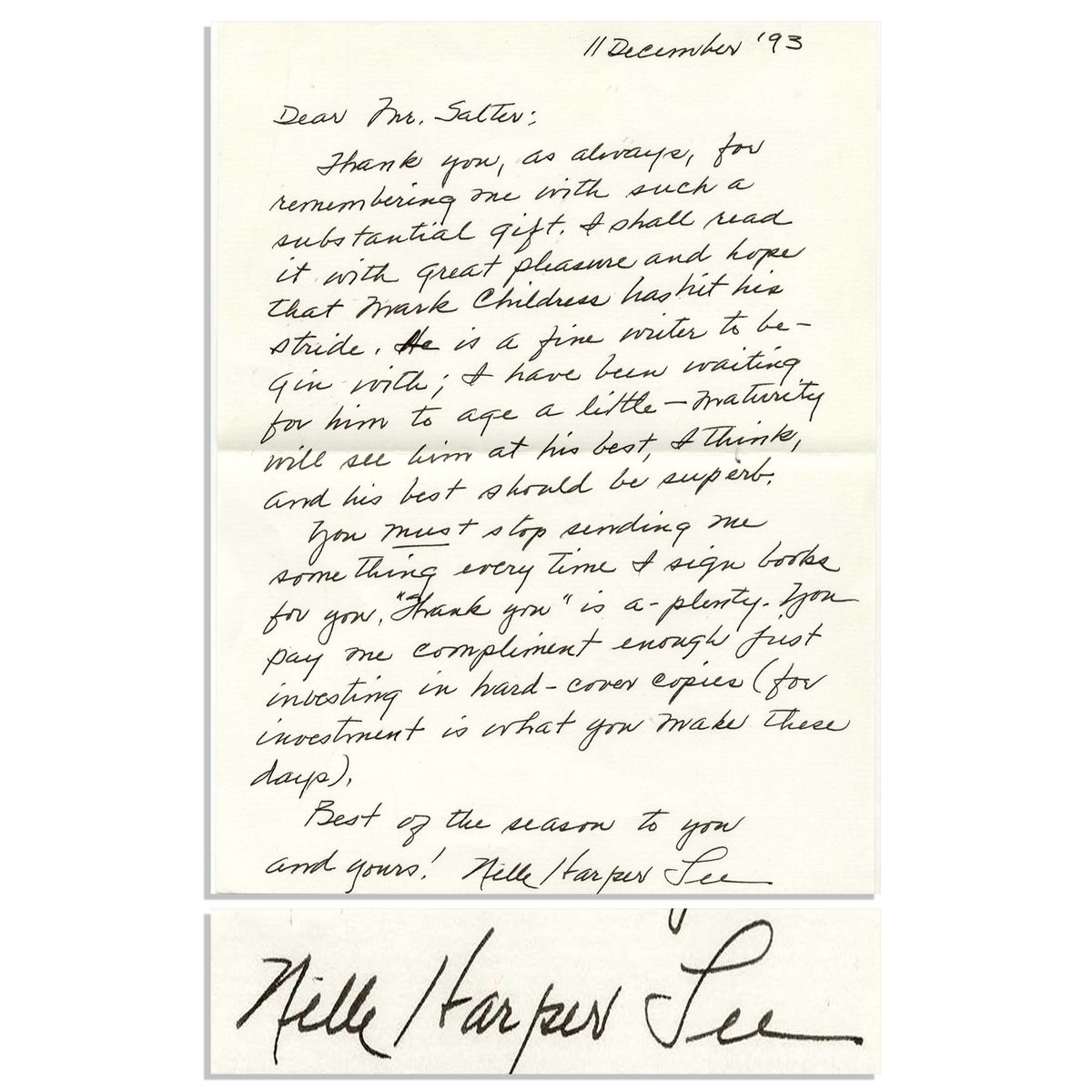 Harper Lee autograph letter signed, dated 11 December 1993 from Monroeville, Alabama. Letter is a reply to Don Salter, a longtime fan of Lee's who wrote the author frequently. Letter reads in full: ''Dear Mr. Salter: Thank you, as always, for remembering me with such a substantial gift. I shall read it with great pleasure and hope that Mark Childress has hit his stride. He is a fine writer to begin with; I have been waiting for him to age a little -- maturity will see him at this best, I think, and his best should be superb. You must stop sending me something every time I sign books for you. 'Thank you' is a-plenty. You pay me compliment enough just investing in hard-cover copies (for investment is what you make theses days). Best of the season to you and yours!'' Signed, ''Nelle Harper Lee''. One page letter, measuring 5.75'' x 7.75'', has one fold from mailing. Also includes original envelope with a Monroeville return address. Near fine.