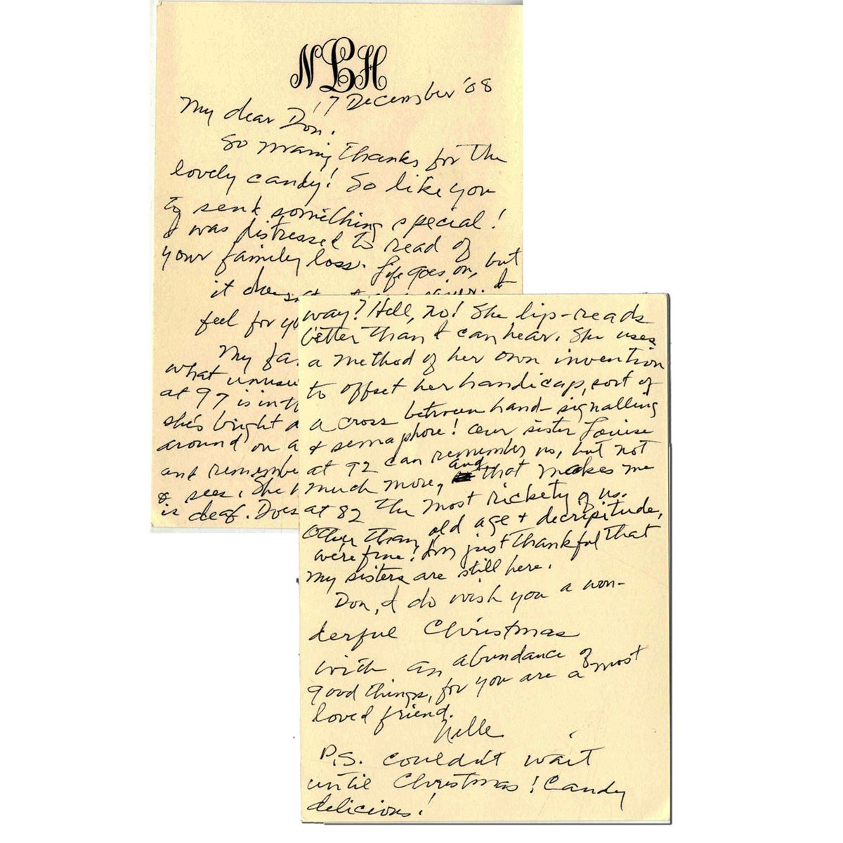Nice Harper Lee autograph letter signed, dated 17 December 2008 on her personal ''NLH'' stationery. Letter reads in full: ''My dear Don: So many thanks for the lovely candy! So like you to send something special! I was distressed to read of your family loss. Life goes on, but it doesn't get any easier. I feel for you. My family ties are somewhat unusual. My eldest sister at 97 is in the best shape of all -- she's bright as a new dime, gets around on a walker at 25mph and remembers everything she reads & sees. She has one handicap: she is deaf. Does that stand in her way? Hell, no! She lip-reads better than I can hear. She uses a method of her own invention to offset her handicap, sort of a cross between hand-signaling & semaphone! Our sister Louise at 92 can remember us, but not much more, and that makes me at 82 the most rickety of us. Other than old age and decrepitude, we're fine! I'm just thankful that my sisters are still here. Don, I do wish you a wonderful Christmas with an abundance of good things, for you are a most loved friend.'' Signed clearly ''Nelle'' with a postscript reading: ''Couldn't wait until Christmas! Candy delicious!'' Card measures 5.25'' x 7.5'' on two pages. Includes original postmarked envelope. Fine condition.