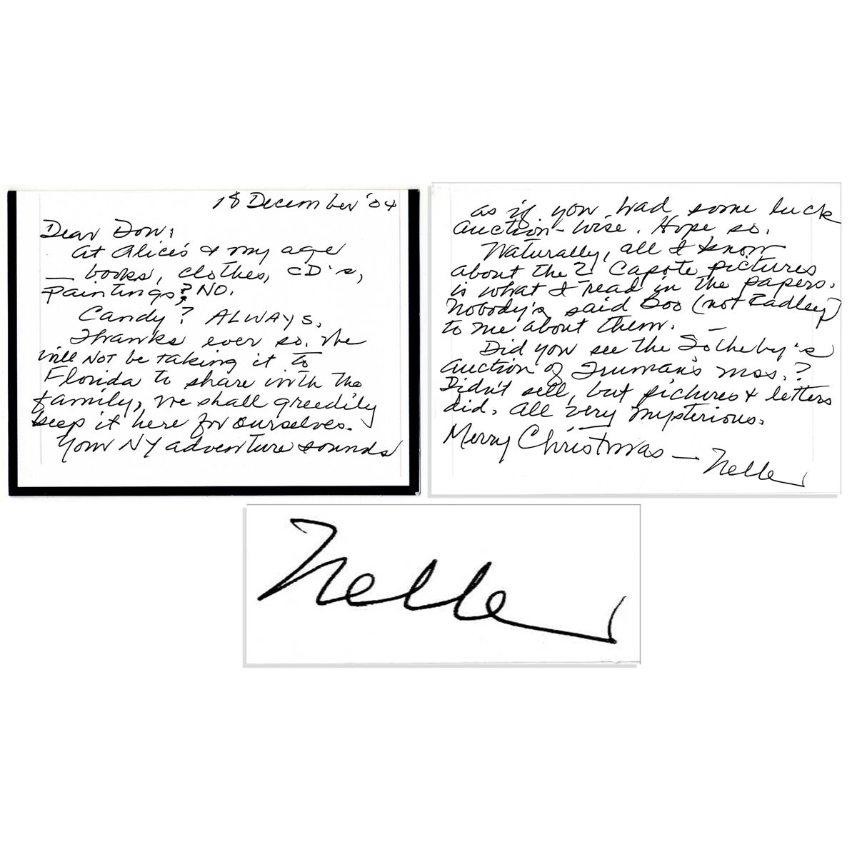 Nice Harper Lee autograph letter signed ''Nelle'', dated 18 December 2004. Letter is addressed to a Don Salter and reads in full: ''Dear Don: At Alice's & my age -- books, clothes, CD's, paintings? No. Candy? Always, Thanks ever so, we will not be taking it to Florida to share with the family, we shall greedily keep it here for ourselves. Your NY adventure sounds as if you had some luck auction-wise. Hope so. Naturally all I know about the 2 Capote pictures is what I read in the papers. Nobody said Boo (not Radley) to me about them. Did you see the Sotheby's auction of Truman's mss. [manuscripts] Didn't sell, but pictures and letters did, all very mysterious. Merry Christmas -- Nelle''. Letter, on two pages, is in a card-style format, with the first page written on the cover of the card and the second page written on its interior. Card measures 5.5'' x 4'' folded and 5.5'' x 8.25'' unfolded. Includes original envelope handwritten with address only. Fine.