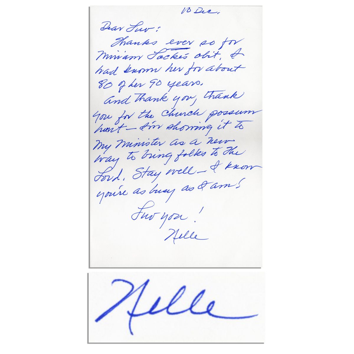 Harper Lee autograph letter signed, dated 10 December 1997. Lee writes to long-time friend Doris Leapard to thank her for the obituary of a mutual friend. The Pulitzer Prize winning author writes, ''Dear Luv...and thank you, thank you for the church possum hunt -- I'm showing it to my minister as a new way to bring folks to the Lord…'' Lee signs, ''Luv you!'' and her first name ''Nelle''. Letter, written on 5'' x 4'' note card, is in fine condition. Accompanying handwritten envelope, postmarked Montgomery, AL, 10 December 1997, is very good.