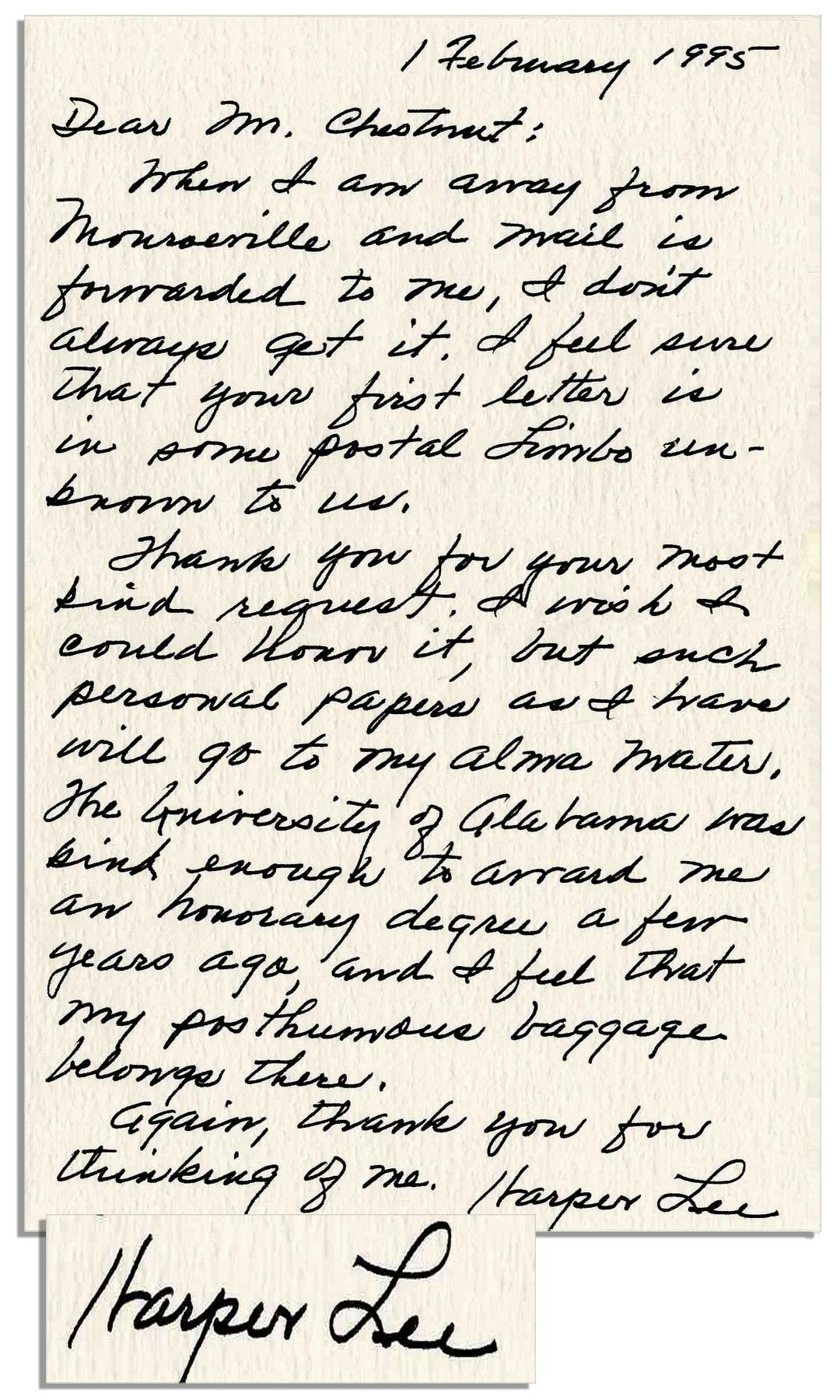 Harper Lee autograph letter signed, dated 1 February 1995. Written on a card featuring an illustration of the quaint Walton DeFuniak Library on the front. Letter is written in fine, clear script with a very bold ''Harper Lee'' signature in black ink. Here, the celebrated author of ''To Kill a Mockingbird'' writes to a Mr. Chestnut from the Humanities department at Auburn University, who presumably asked Lee to donate some of her personal letters. Reads in full: ''Dear Mr. Chestnut: When I am away from Monroeville and mail is forwarded to me, I don't always get it. I feel sure that your first letter is in some postal Limbo unknown to us. Thank you for your most kind request. I wish I could honor it, but such personal papers as I have will go to my alma mater. The University of Alabama was kind enough to award me an honorary degree a few years ago, and I feel that my posthumous baggage belongs there. Again thank you for thinking of me. Harper Lee''. Also includes the original envelope addressed by Harper Lee in her own hand with a return address of a P.O. Box in Monroeville, Alabama. Card measures 5'' x 7.5'' when unfolded. Fine condition.