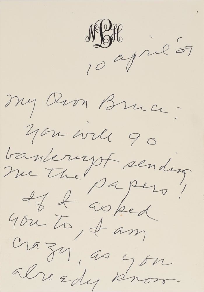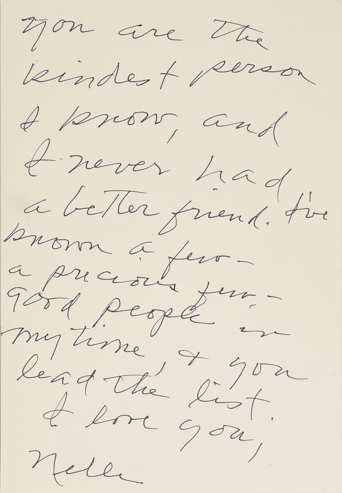 Heartfelt ALS signed “Nelle,” one page both sides, 5.25 x 7.5, personal monogrammed letterhead, April 10, 2007. Letter to her close friend and New York neighbor Bruce Higginson, in full: "You will go bankrupt sending me the papers! If I asked you to, I am crazy, as you already know. You are the kindest person I know, and I never had a better friend. I've known a few—a precious few—good people in my time, & you lead the list. I love you." In very fine condition. Accompanied by the original mailing envelope addressed in Lee's own hand.