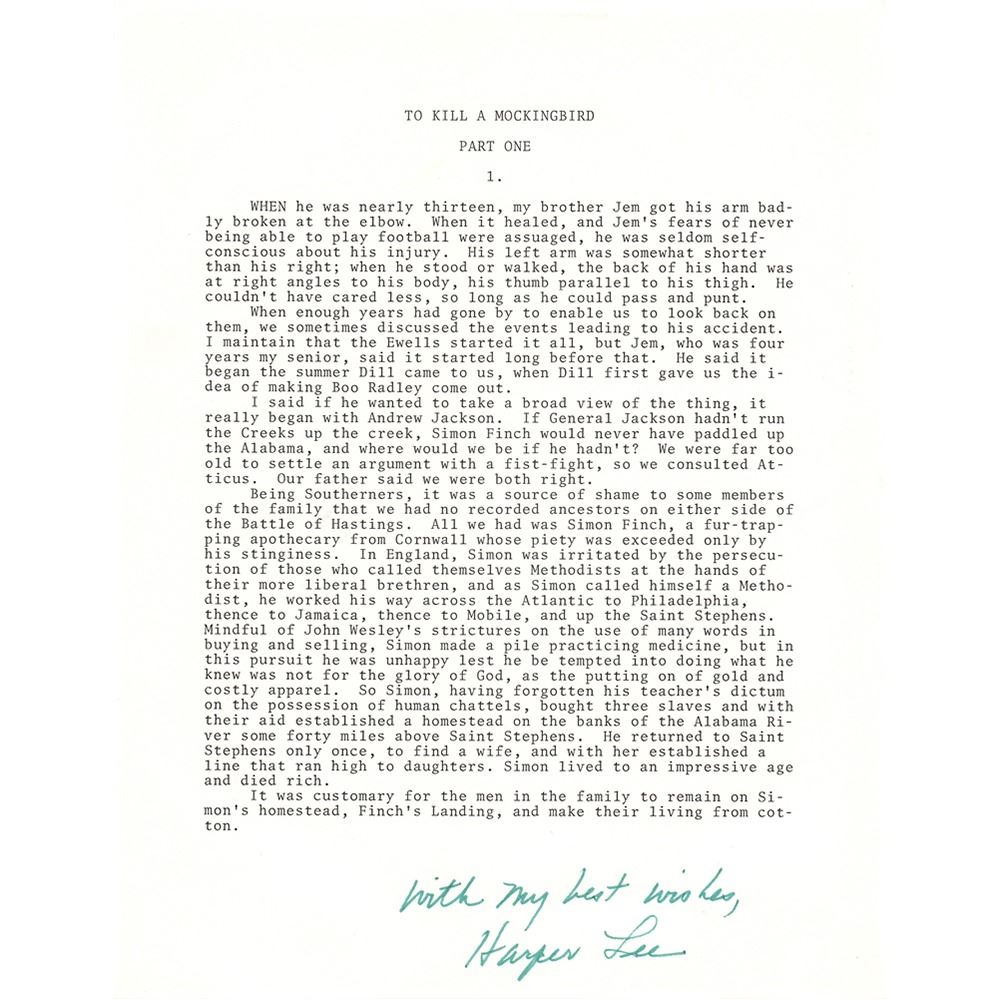 Souvenir typescript, one page, 8.5 x 11, signed in green ink, "With my best wishes, Harper Lee." The opening of To Kill a Mockingbird, in part: "When he was nearly thirteen, my brother Jem got his arm badly broken at the elbow. When it healed, and Jem's fears of never being able to play football were assuaged, he was seldom self-conscious about his injury. His left arm was somewhat shorter than his right; when he stood or walked, the back of his hand was at right angles to his body, his thumb parallel to his thigh. He couldn't have cared less, so long as he could pass and punt." In very fine condition.