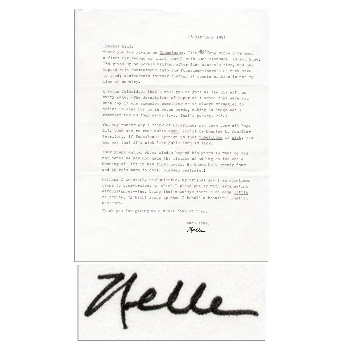 Harper Lee typed letter signed on 28 February 1994. Lee is responding to being sent a new novel, ''Tuscaloosa'' by W. Glasgow Phillips from her friend, ''…Dearest Bill…'' She compares the author to ''…a young Coleridge, that’s what you've got… get down your old Eng. Lit. book and re-read Kubla Khan. You'll be haunted by familiar territory… [Signed] Nelle''. Lee also confesses to being, ''…overly enthusiastic. My friends say I am sometimes prone to over-praise to which I plead guilty…'' 11'' x 8.5'' letter is in fine condition.