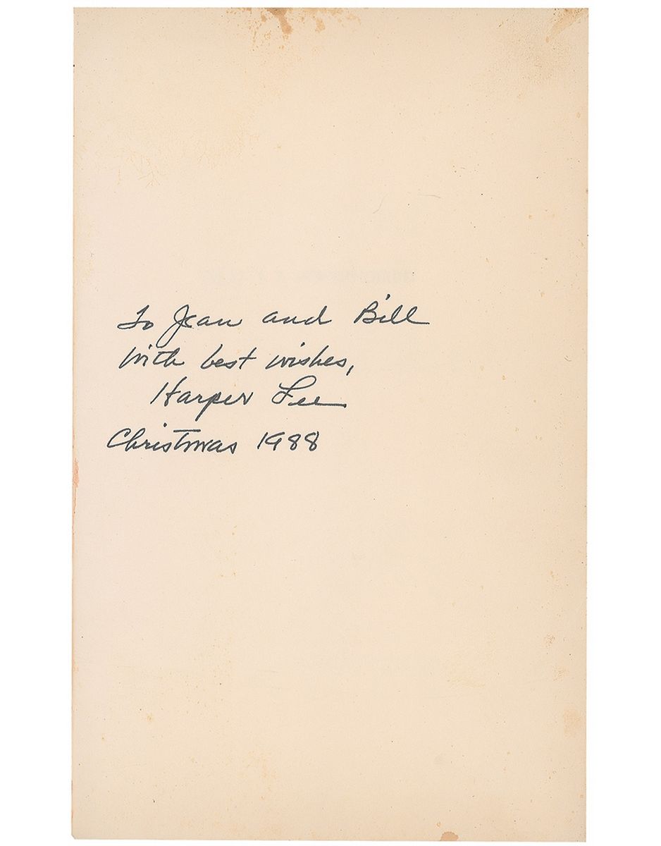 Signed book: To Kill a Mockingbird. First edition (stated explicitly on the copyright page). Philadelphia: J.B. Lippincott Company, 1960. Hardcover with dustjacket, 5.75 x 8.25, 296 pages. Signed and inscribed later on in black felt tip, “To Jean and Bill, With best wishes, Harper Lee, Christmas 1988” on a similarly-sized page which has been inserted and affixed into the front of the volume. The book is in very good condition, with some light staining and creasing to signed page, light soiling and bookplate remnant to first free end page, scattered soiling and wear to covers and spine, and binding a bit loose. The dustjacket shows scattered moderate creasing, heavier to the front, paper loss along spine and edges, and light toning and soiling; its inside flap shows the original price of $3.95 along with Truman Capote’s blurb of praise, and his photo of Lee graces the jacket’s back panel. A rare opportunity to acquire a scarce first edition of a modern classic.