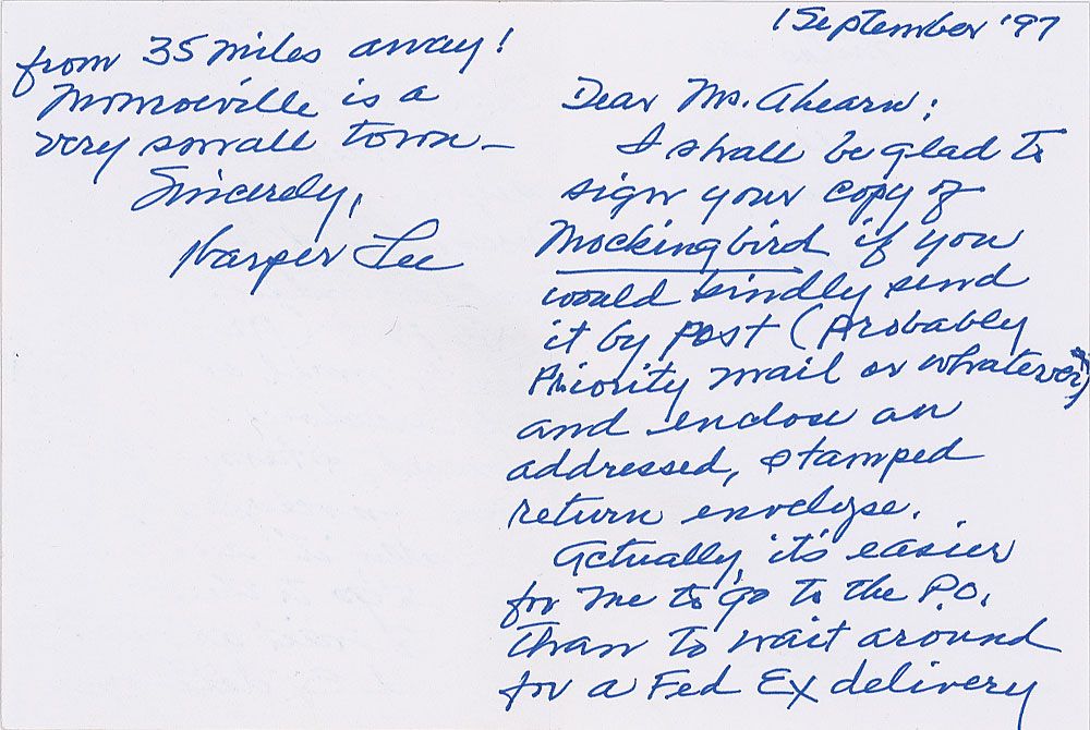 ALS, two pages on a 3.75 x 5 greeting card, September 1, 1997. Letter to an admirer. In part: “I shall be glad to sign your copy of Mockingbird if you would kindly send it by post…it’s easier for me to go to the P. O. than to wait around for a Fed Ex delivery from 35 miles away! Monroeville is a very small town.” In fine condition. Accompanied by the original mailing envelope, filled out in her own hand, signed “Lee” in the return address area. To Kill a Mockingbird is set in the fictional town of Maycomb, modeled on Lee’s hometown of Monroeville.