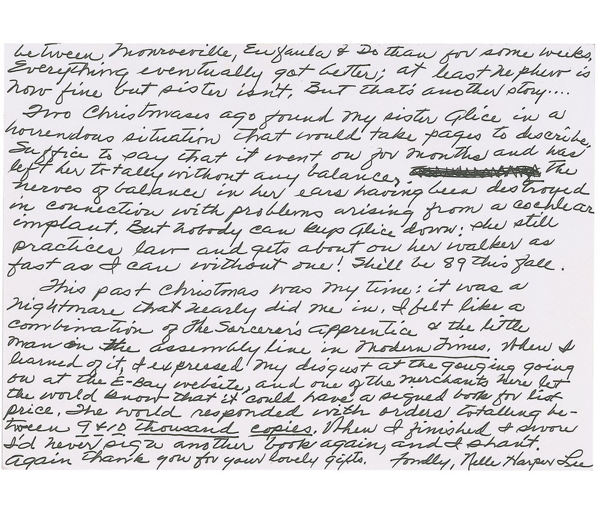 Scarce ALS signed “Nelle Harper Lee,” one page both sides, 6.25 x 4.5, personal monogrammed letterhead, February 2, 2000. Letter to Don Salter in Mobile, Alabama. In part: “This past Christmas was my time: it was a nightmare that nearly did me in. I felt like a combination of The Sorcerer’s Apprentice & the little man in the assembly line in Modern Times. When I learned of it, I expressed my disgust at the gouging going on at the E-Bay website, and one of the merchants here let the world know that it could have a signed book for list price. The world responded with orders totaling between 9 & 10 thousand copies. When I finished I swore I’d never sign another book again, and I shan’t.” In fine condition. Accompanied by the original mailing envelope addressed in Lee’s own hand.