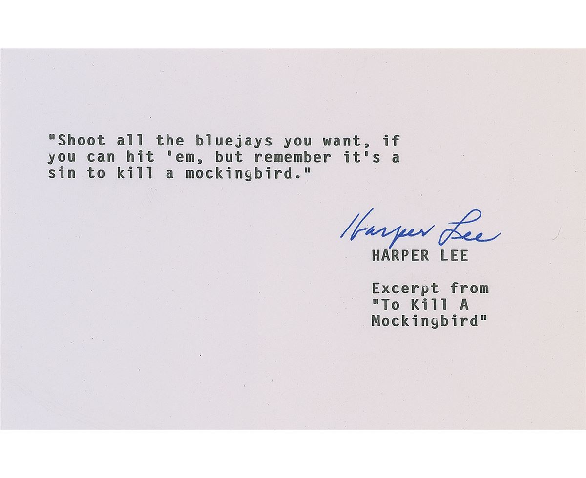 Highly desirable souvenir TQS, one page, 6 x 4, signed at the conclusion in blue felt tip. A quote from her classic To Kill a Mockingbird. In full: “Shoot all the bluejays if you want, if you can hit ’em, but remember it’s a sin to kill a mockingbird.” In fine condition.