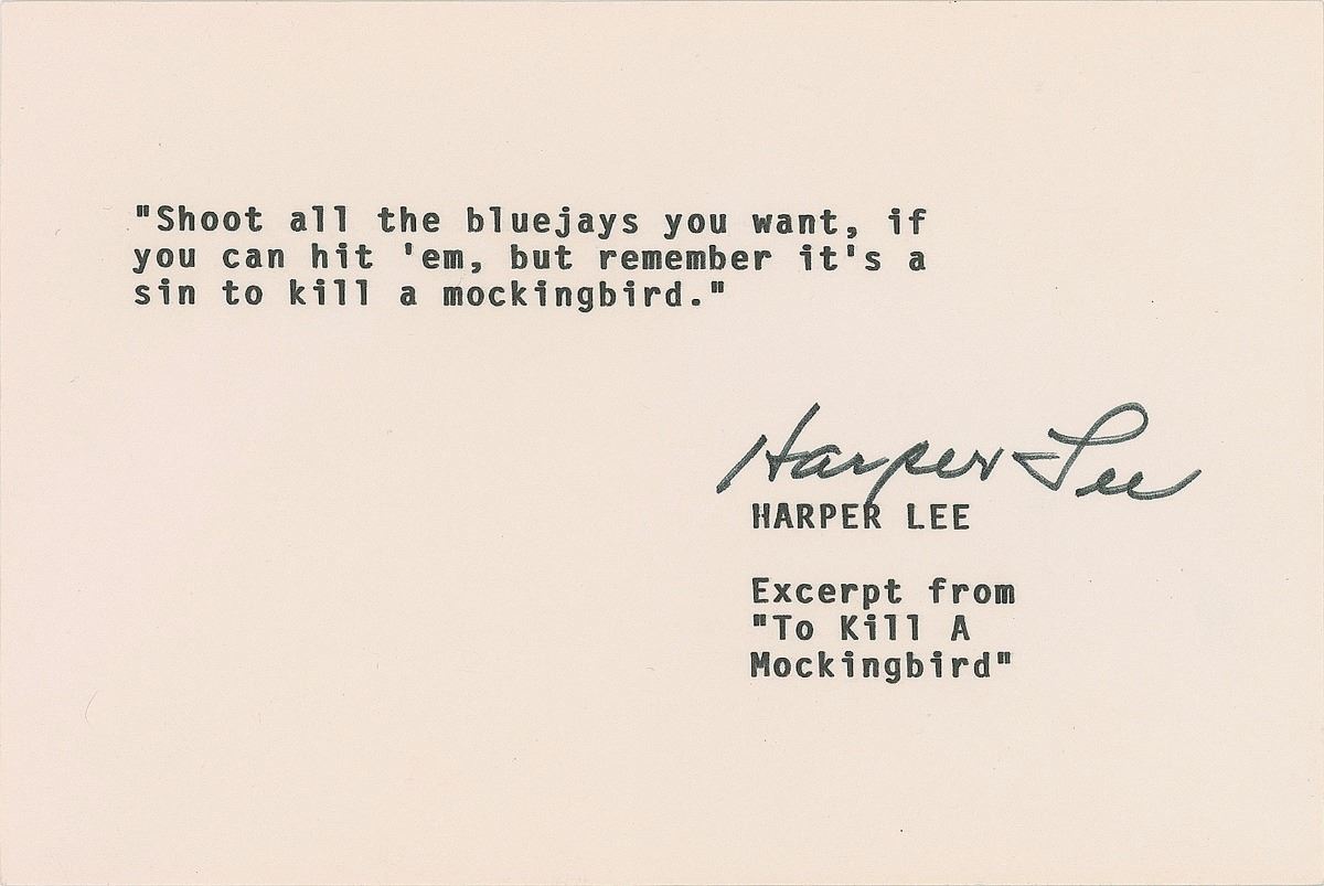 TQS on an off-white 6 x 4 card, signed in black felt tip by Lee. An excerpt from To Kill a Mockingbird, in full: “‘Shoot all the bluejays you want, if you can hit ’em, but remember it’s a sin to kill a mockingbird.’” In fine condition.