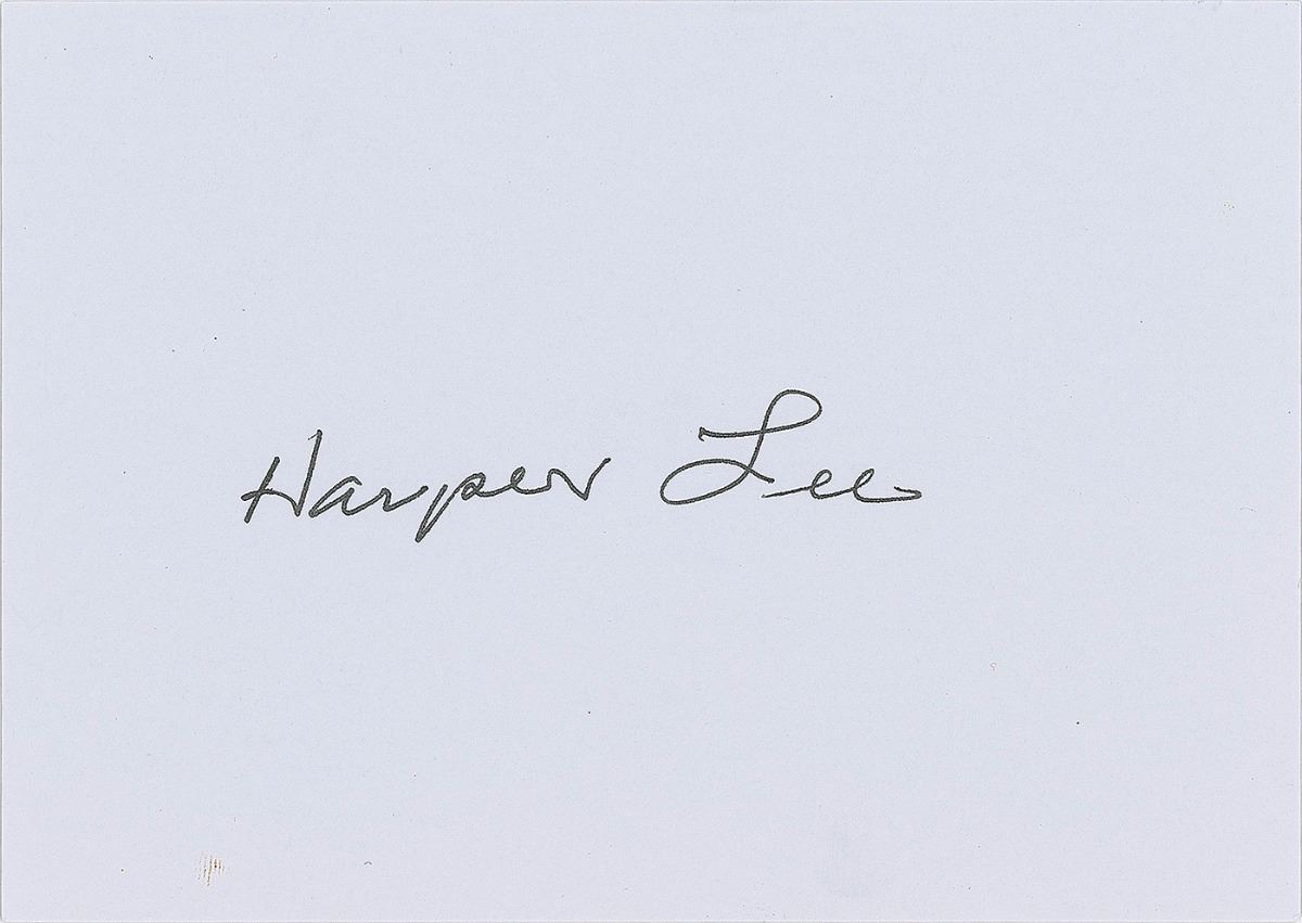 Ink signature, “Harper Lee,” on a white 5.75 x 4 sheet. In fine condition. Accompanied by the original mailing envelope.