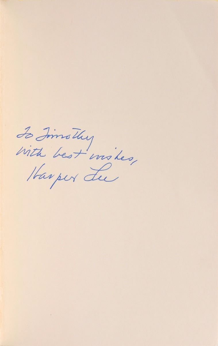 Signed book: To Kill a Mockingbird. First edition. Philadelphia & New York: J. B. Lippincott Company, 1960. Hardcover (brown boards and light green cloth spine with brown titles) with dust jacket (price-clipped, Jonathan Daniels quote on back flap, Truman Capote photo credit on reverse), 5.5 x 8.25, 296 pages. Signed and inscribed in blue felt tip on a page neatly tipped in after the title page, “To Timothy, with best wishes, Harper Lee.” Autographic condition: fine. Book condition: VG/G+, with moderate wear to clipped dust jacket including creasing and a few small areas of paper loss (most notably to spine).