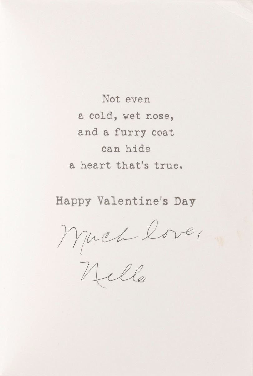 Valentine’s Day card from 2010, showing a small furry puppy on the front, measuring 11 x 8 open, signed inside below a printed sentiment in black ink, “Much love, Nelle.” In fine condition, with a couple of small creases to the front of the card. Accompanied by the original mailing envelope, address in Lee’s own hand to longtime friend Bruce Higgison, postmarked February 13, 2010.