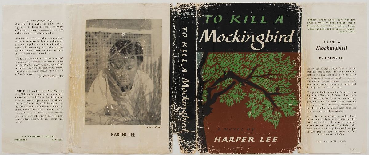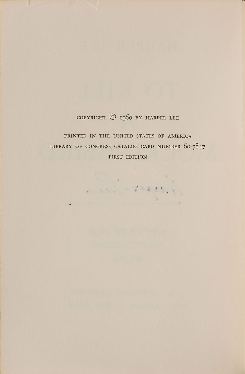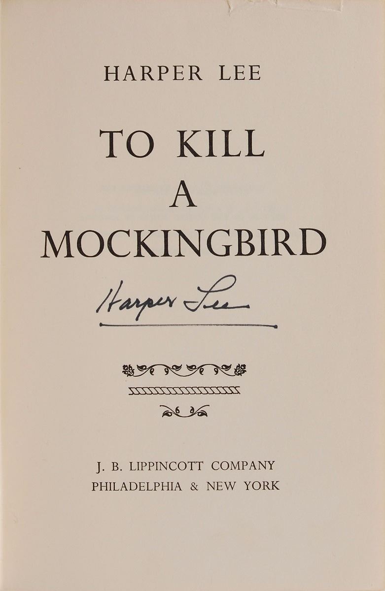 Signed book: To Kill a Mockingbird. First edition. Philadelphia & New York: J. B. Lippincott Company, 1960. Hardcover (brown boards and light green cloth spine with brown titles) with original unclipped dust jacket ($3.95 price on front flap, Jonathan Daniels quote on back flap, Truman Capote photo credit on reverse), 5.5 x 8.25, 296 pages. Signed later on the title page in black felt tip, “Harper Lee.” Autographic condition: fine, with three tiny tears to the top edge of the title page. Book condition: VG+/G+, with moderate wear to dust jacket including creasing and a few small areas of paper loss (most notably to spine). Accompanied by a custom-made clamshell case.