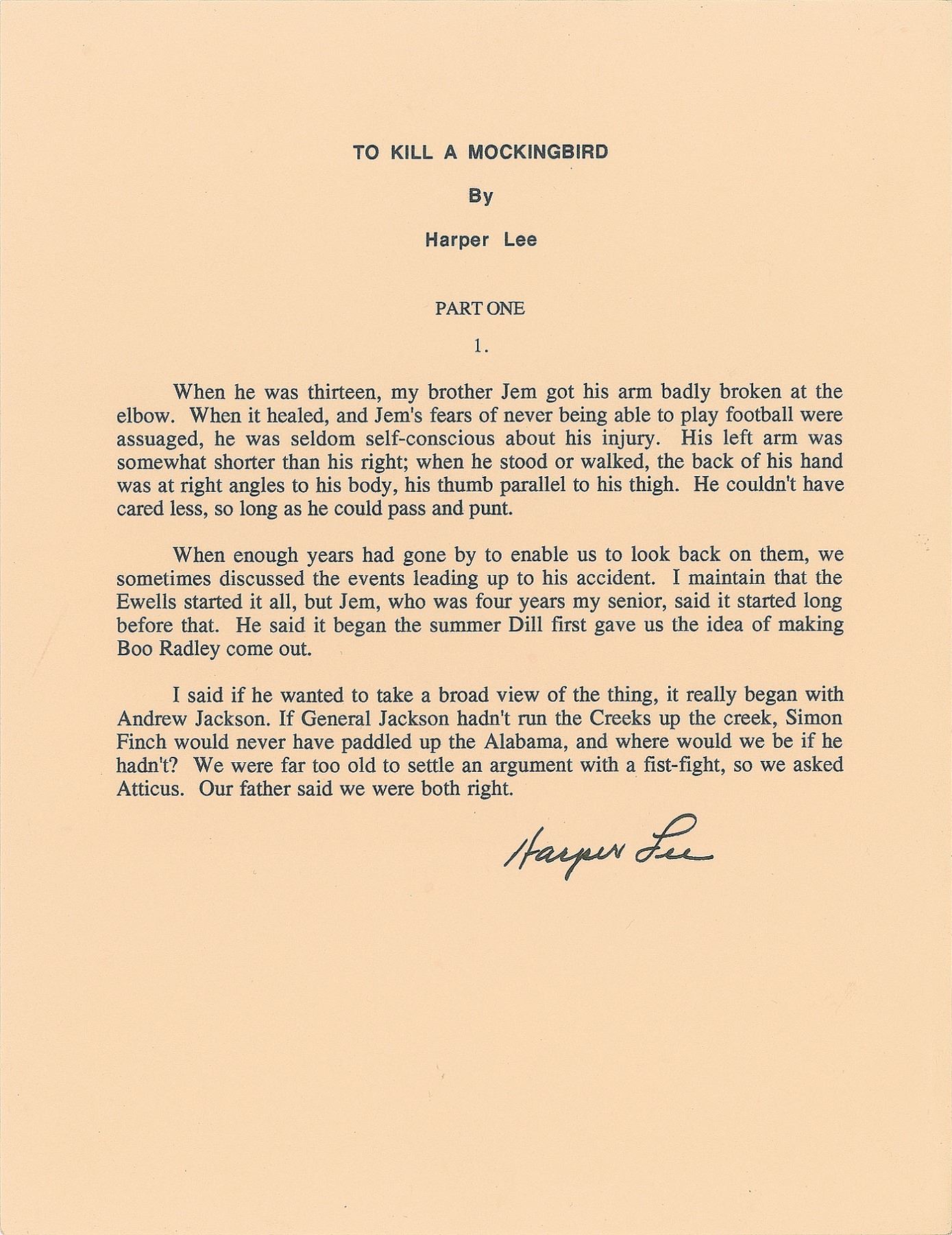 Souvenir typescript of the opening from To Kill a Mockingbird, one page, 8.5 x 11, signed in black felt tip by Lee. In part: "When he was nearly thirteen, my brother Jem got his arm badly broken at the elbow. When it healed, and Jem's fears of never being able to play football were assuaged, he was seldom self-conscious about his injury. His left arm was somewhat shorter than his right; when he stood or walked, the back of his hand was at right angles to his body, his thumb parallel to his thigh. He couldn't have cared less, so long as he could pass and punt." In fine condition.