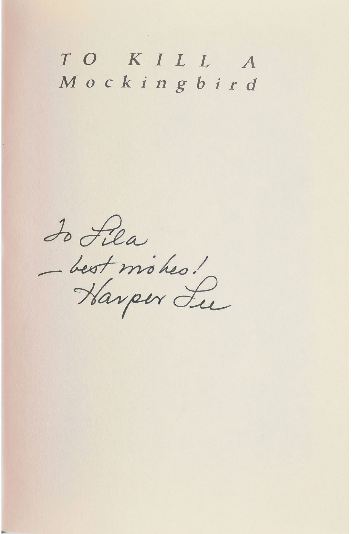 Signed book: To Kill a Mockingbird. 40th Anniversary Edition, first printing (with "1" in the number line). NY: HarperCollins, 1999. Hardcover with "35th Anniversary Edition" dust jacket, 5.5 x 8.25, 323 pages. Signed and inscribed on the half-title page in black felt tip, "To Lila—best wishes! Harper Lee." In fine condition.